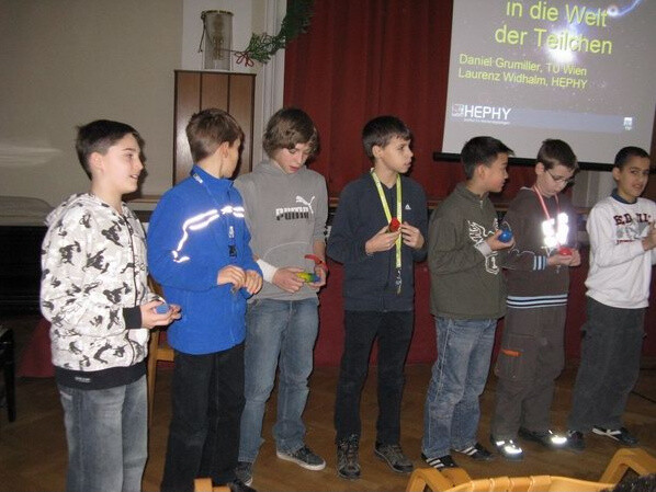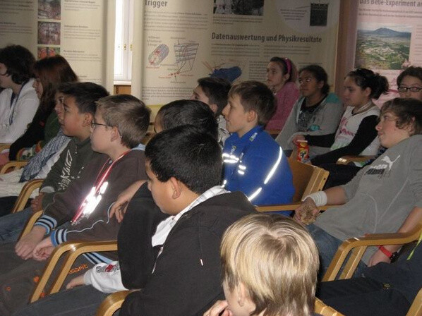 Die Vortragenden bringen den Schülerinnen und Schülern diese Themen spielerisch mit magnetischen Modellen von Elementarteilchen, Powerpoint- Präsentation und Besichtigung der Funkenkammer bei.