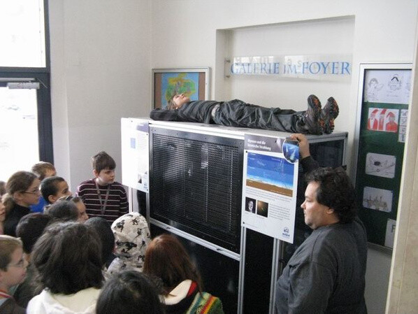 Der Schüler Laurin legt sich "tapfer" auf die Funkenkammer und lässt sich schmerzfrei von Myonen durchschießen!!