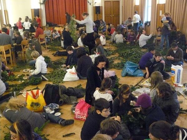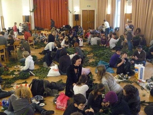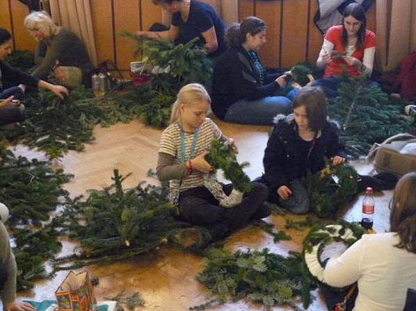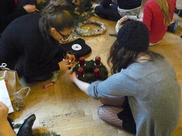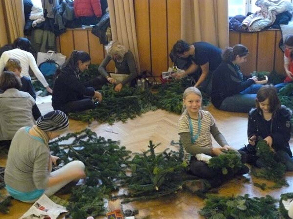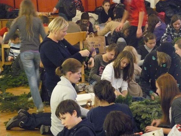 Rechtzeitig zu Adventbeginn gab es auch heuer wieder die Möglichkeit zum Adventkranzbinden. Am Freitagnachmittag vor dem ersten Adventwochenende duftete der ganze Festsaal nach Reisig. Groß und Klein, Alt und Jung, SchülerInnen und LehrerInnen, Eltern und auch "Ehemalige" saßen nebeneinander am Boden und gestalteten bei besinnlicher Musik Adventkränze für zuhause und Klassenräume. Ein stimmungsvoller Nachmittag!