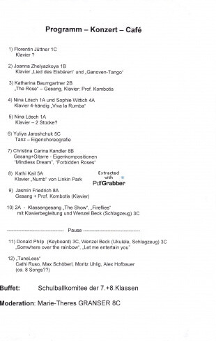 Das Buffet wurde vom Schulballkomitee organisiert, herzlichen Dank an die Kolleginnen Prof. Irini Kombotis am Klavier, Prof. Margit Salti mit der Kamera sowie bei den Schülern und Schülerinnen der Band Tuneless und der Technik, die durch Auf- und Umbauarbeiten mir tatkräftig zur Seite standen.