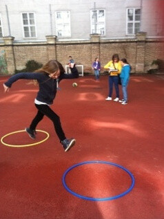 Wir machten einen Workshop über Sport und Geografie. Wir haben einen Parcours mit Hütchen, Hula-Hoop Reifen, Springseilen und Tennisbällen vorbereitet. Man musste mit dem Hula-Hoop Reifen um die Hütchen Slalom laufen. Anschließend sollte man die Tennisbälle in einen Eimer werfen, was aber nicht sehr viele geschafft haben. Danach musste man zehn Mal Seilspringen. Darauf folgten drei Liegestütz bei denen man eine Tasche auf den Rücken getragen hat. Währenddessen wurden einem Fragen über den Stoff den die jeweilige Klasse in Geografie durchgemacht hatte.