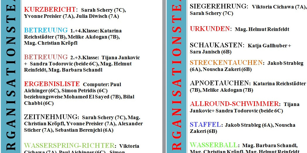 Um 10:15 Uhr nahm der spannende Schwimmwettbewerb ein Ende, und das Streckentauchen samt Wasserspringen begann. Man konnte die wunderschönsten Kreationen von Sprüngen zeitgleich mit dem Streckentauchen und Apnoetauchen bewundern. Hervorragend beim Apnoetauchen war Cornelia Pichler mit unglaublichen 54 Sekunden 59, Schulrekord bei den Mädchen