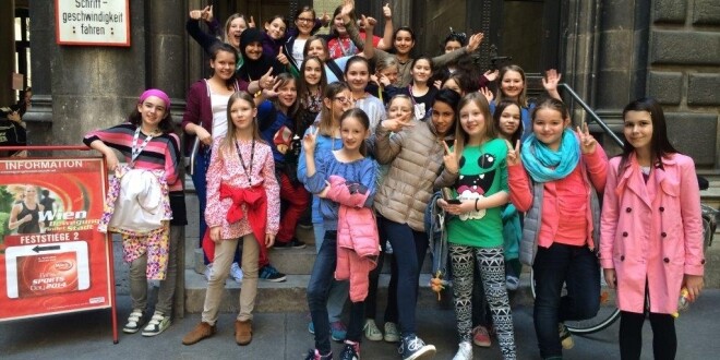 Die Mädchen der 1A und 1B beim Besuch des "Girlies Sports Day" im Rathhaus am 8. April in der 5. und 6. Stunde im Rahmen des BSP-Unterrichts mit Prof. Sandner und Prof. Willers