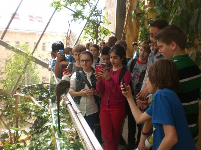 Im Haus des Meeres wurde uns die Ernährung verschiedenster Tierarten vorgestellt. Angefangen von Quallen über Gift- sowie Riesenschlangen und Seeschildkröten bis hin zu farbenprächtigen Fischen und wunderschönen Korallen. Auch die berüchtigten Piranhas sowie die fleißigen Blattschneiderameisen haben zur Begeisterung beigetragen. Das schöne Wetter lockte uns natürlich hinauf auf die Dachterasse mit wunderschönem Blick über die Dächer Wiens, und zum Aufwärmen ging es danach in den Krokipark und in das Tropenhaus, wo viele zu großen Fans von den frei herumlaufenden Weißbüscheläffchen wurden. Sehr spannend waren auch die Schützenfische, die durch einen gezielten Wasserstrahl Insekten herunterschießen können. Zum Abschluss gingen viele von uns noch auf eine besondere Erinnerung mit bunten Fischen, welche gestreichelt werden durften.