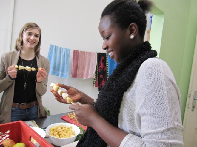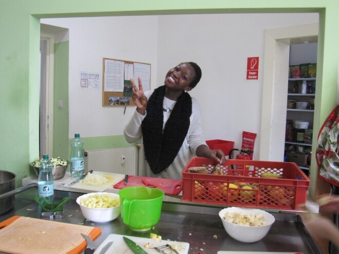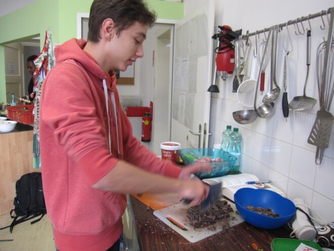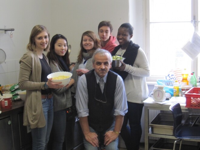 Nach unserem Eintreffen erhielten zwei Schülerinnen, die das VinziPort noch nicht kannten, eine Führung von Herrn Shahali, dem Leiter der Einrichtung, während sich die bereits ortskundigen Schüler/innen in der Vorratskammer um die später benötigten Zutaten kümmerten.