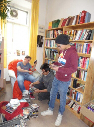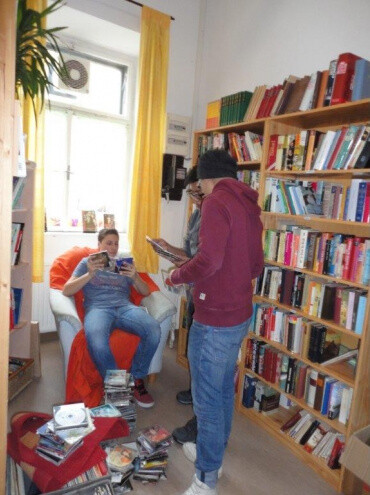 Währenddessen entstaubten Mehdi und ich die Vasen und das Geschirr. Als Paul fertig war, packten wir die Gelegenheit beim Schopf und schossen ein Foto mit ihm neben seinem Kunstwerk. Wie sich herausstellte, hatte eine Taube auf Paulis Weste ihr eigenes Kunstwerk hinterlassen, während er draußen war. Mehdi sagte daraufhin, dass es zum Berufsrisiko gehört. Paul half uns dann beim Putzen. Als wir fertig waren, sortierten wir die CDs, was sich als Herausforderung darstellte, da es sehr viele gab und wir sie in die jeweiligen Musikkategorien einteilen sollten. Schlussendlich schafften wir die Herausforderung. Dann wurde uns der Lagerraum gezeigt, in dem die Sachspenden aufbewahrt werden, die aufgrund ihrer Themen, zum Beispiel im Winter besser verkauft werden können. Bevor wir gingen, wurden uns noch Mehlspeisen angeboten, die wir dankend angenommen haben. Anschließend trennten wir uns und verteilten noch ein paar Flyer in der Nähe.