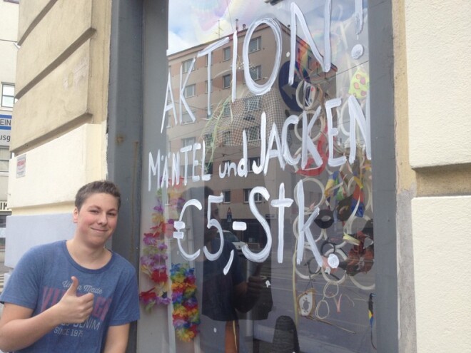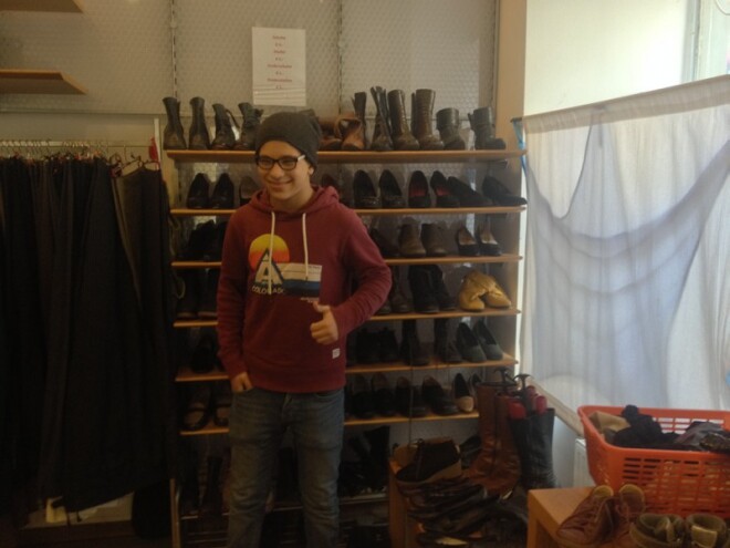 Wir arbeiteten im VinziShop, der gegenüber von VinziBett, einer Schlafstelle, ist. Der VinziShop ist ein Second-Hand-Laden in dem CDs, Kleidung, Geschirr und Spielzeuge günstig verkauft werden. Dort haben wir dann die Schuhe zum Verkauf ausgestellt, sowie Schals, Hauben und Handschuhe geordnet, bevor wir dann getrennt wurden. Als die Geschäftsleiterin dann fragte, wer die schönste Schrift hätte, haben wir Paul, wie er es nennt, „verraten“ und er musste dann hinausgehen und etwas an die Fenster schreiben.
