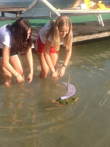 Um 15 Uhr 30 wurden fünf Module seitens der Lehrer/innen angeboten, die die verschiedenen Sportgruppen absolvieren mussten: Draußen-SEIN bei unseren besten Freunden, den Bäumen; Geo-Cashing; Umweltethik; Entschleunigung; Boot-bauen. Danach ging´s bei herrlichstem Spätsommerwetter zum Schwimmen oder zum Wasserspringen…