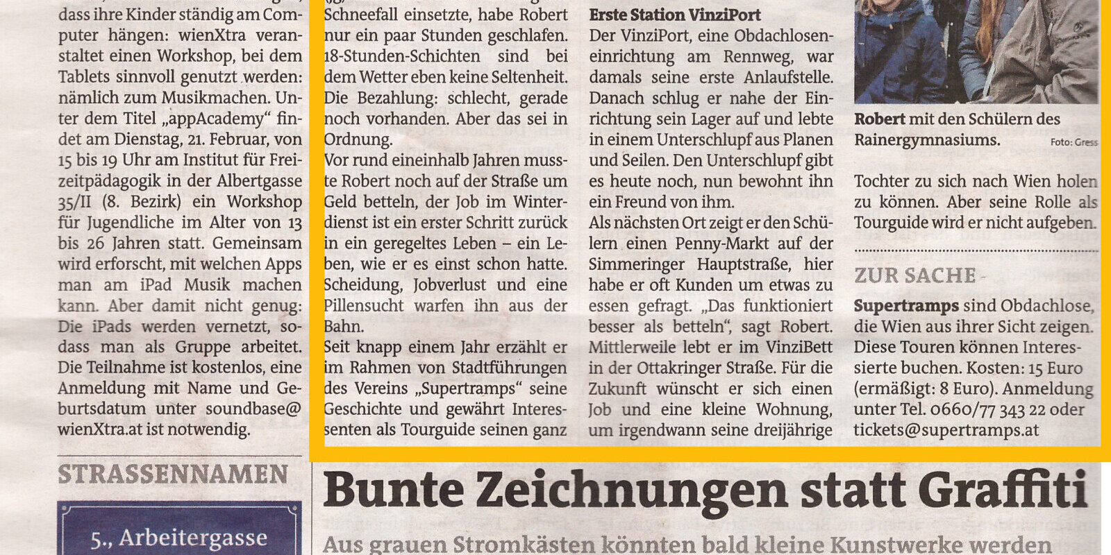 Als Vorbereitung auf eine ungewöhnliche Stadtführung beschäftigten sich zwölf Schülerinnen und Schüler der 4. bis 6. Klassen in einem Workshop mit Teresa Bodner vom Verein „Supertramps“ mit den Ursachen und Folgen von Obdachlosigkeit. Später lernten sie bei der Notschlafstelle VinziPort am Rennweg Robert kennen, der die Gruppe eineinhalb Stunden lang an verschiedene Schauplätze seines Lebens als Obdachloser führte, vom selbstgebauten Verschlag über einen Supermarkt, wo er oft etwas zu essen bekam, bis hin zu einem Tageszentrum.