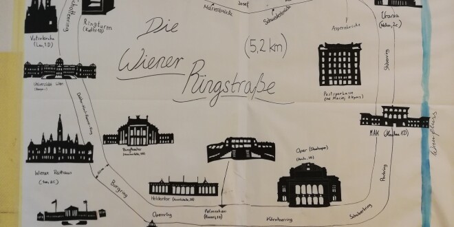 Die Schülerinnen und Schüler erarbeiteten sich das Thema mit eigener Recherche, Quiz- sowie Rätselspielen, als vorzeigbares Ergebnis schnitten sie die Gebäude als Scherenschnitt aus und platzierten diese auf einem anschaulichen Plan der Ringstraße.