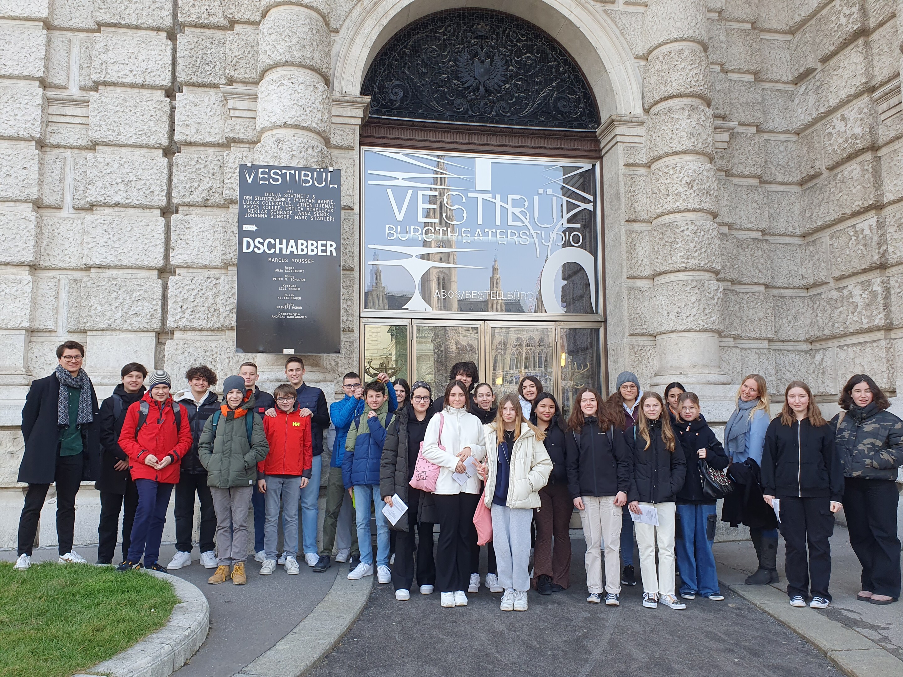 Am 23. Februar 2023 besuchte die 4B im Rahmen des Deutschunterrichts das Theaterstück „Dschabber“ im Wiener Burgtheater. Neben dem Theaterstück selbst gab es beim anschließenden Publikumsgespräch mit dem Schauspielensemble und der Regisseurin die Möglichkeit, einen ersten Einblick in den Theaterbetrieb, die Inszenierung eines Stücks sowie die Arbeit auf und hinter der Bühne zu erhalten.