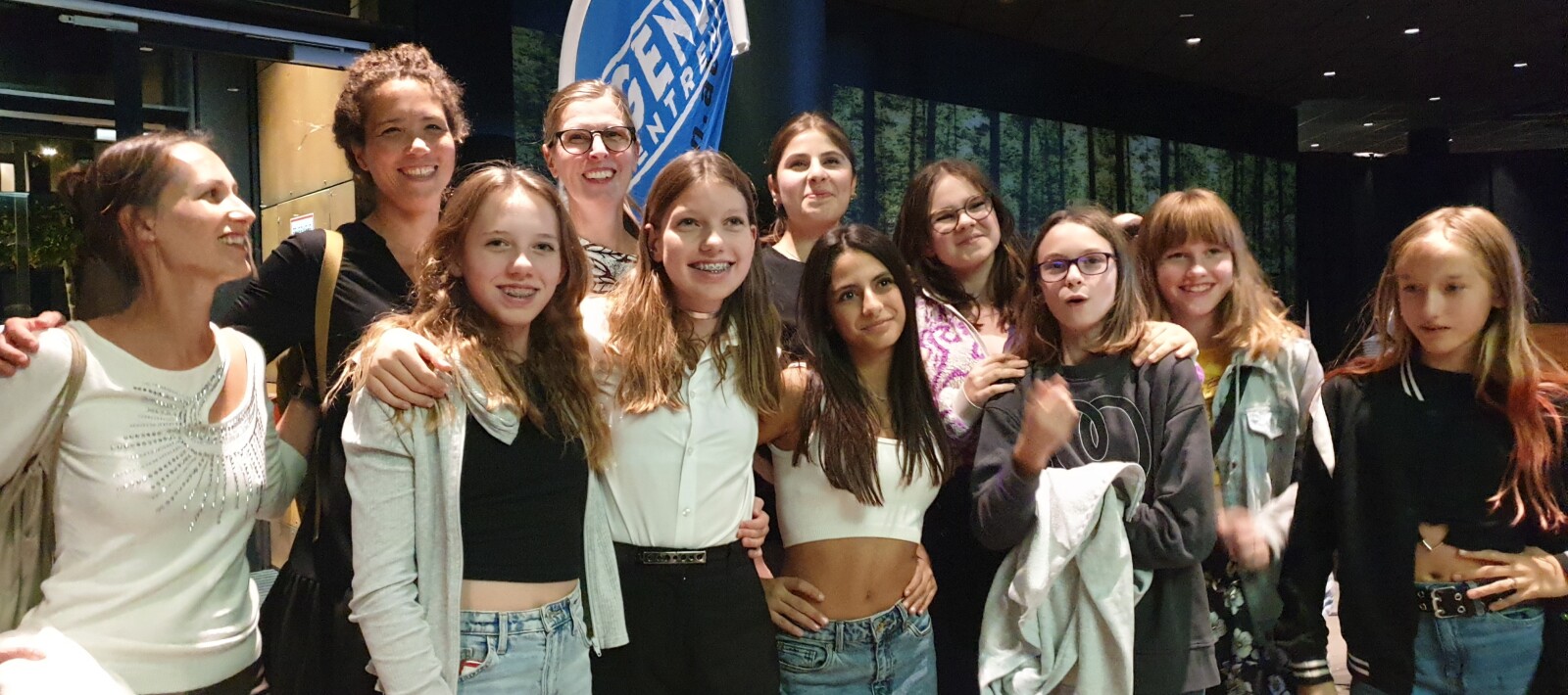 Die Modenschau war sehr gut vom Rainergymnasium besucht. Unsere Schüler:innen aus der 3B und andere, Prof. Schenner, Prof. Varga und Prof. Drack hatten viel Spaß bei der Show, wie man auch am Foto sehen kann. Es war ein rundum gelungener Abend.