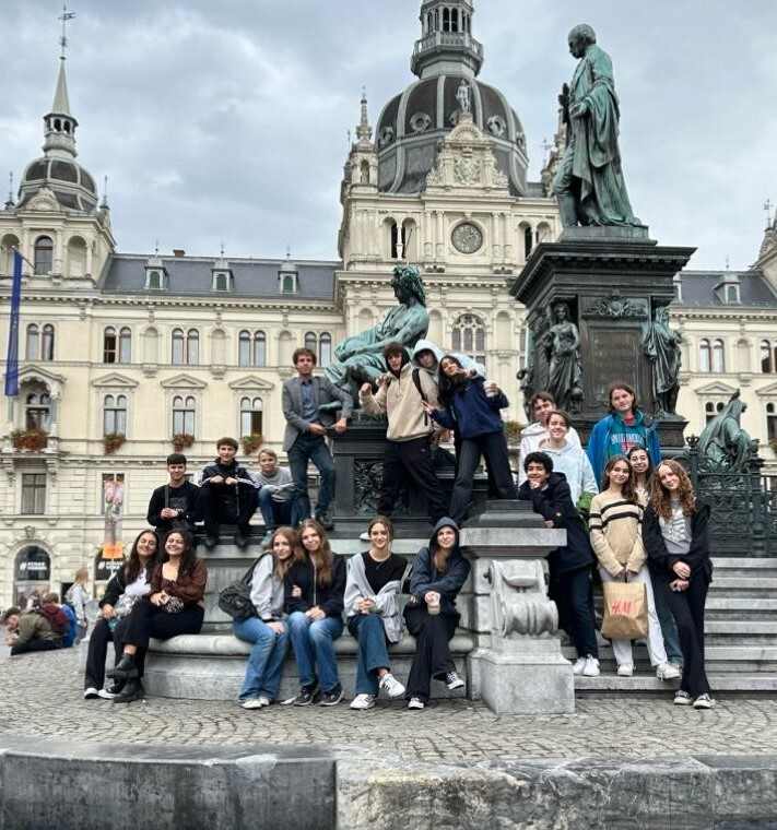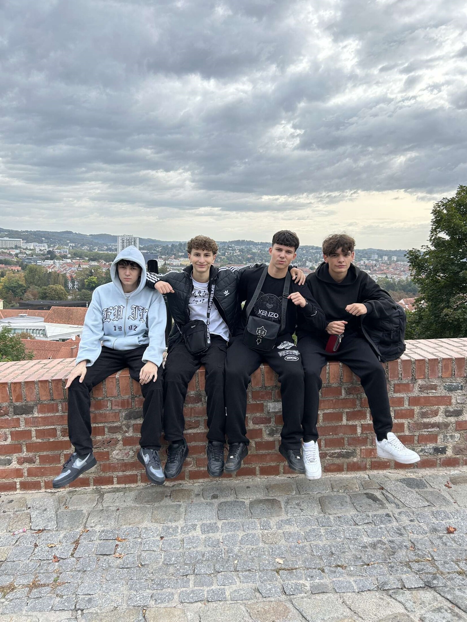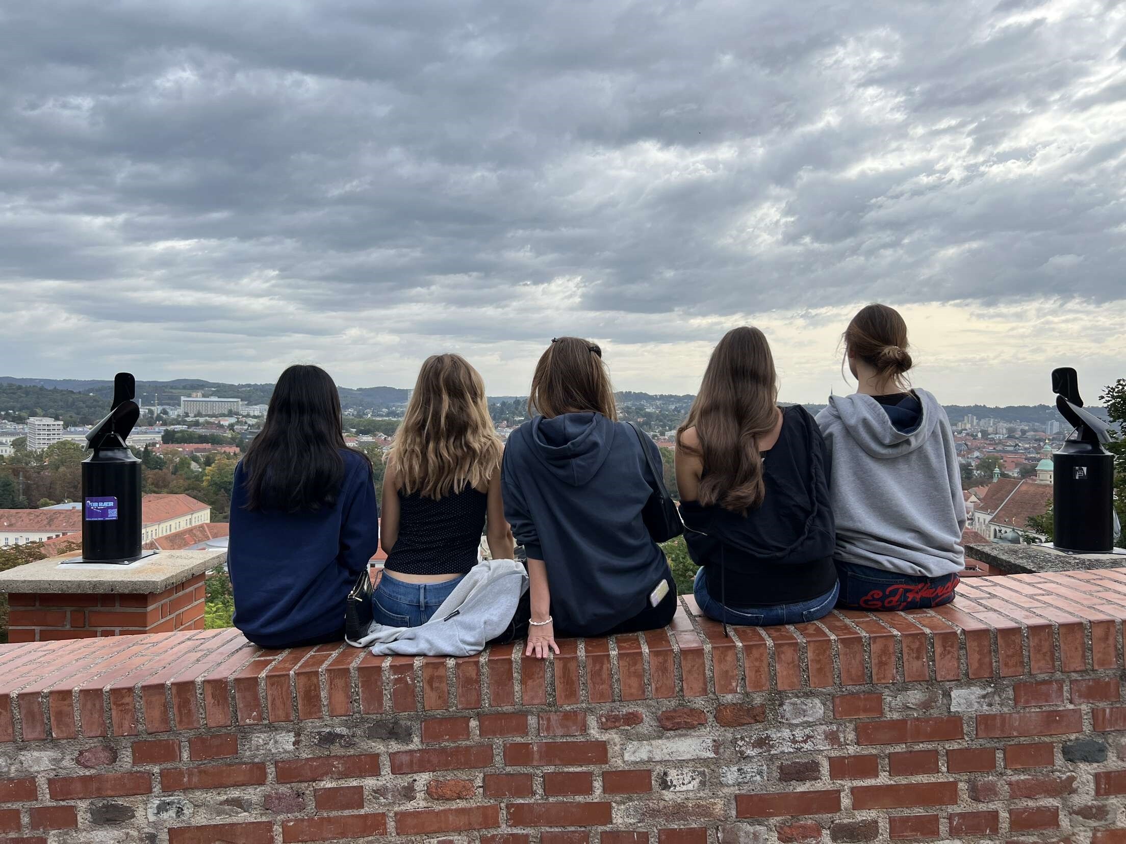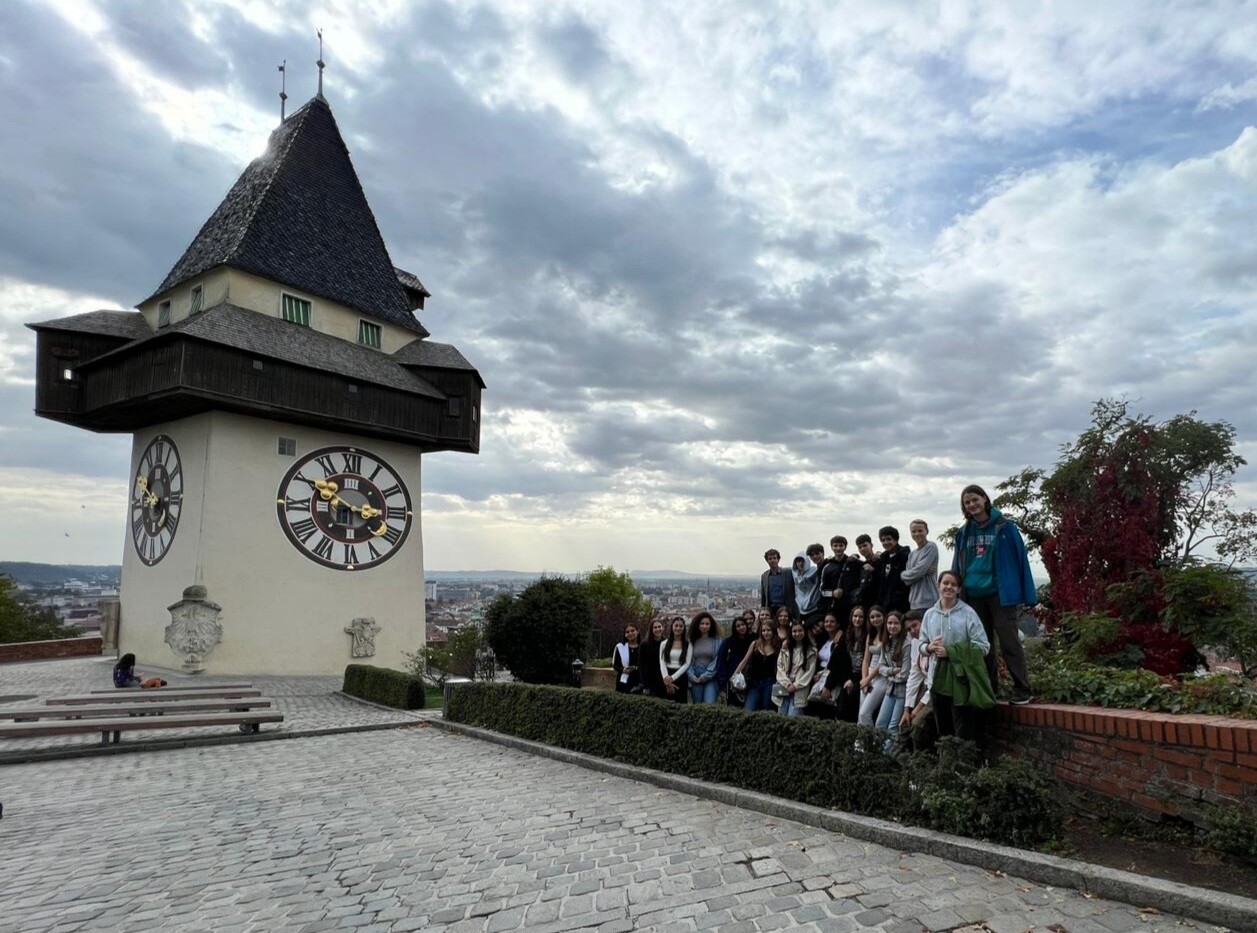 Während der Zugfahrt genossen wir die Aussicht auf der schönen Strecke. In Graz angekommen begannen wir sofort, die Stadt zu erkunden. Dr. Cvetko erzählte uns viel Interessantes über die bewegte Stadtgeschichte und führte uns am Vormittag auf den Schlossberg und zum Uhrturm. Von dort erfreuten wir uns an der tollen Aussicht über die Stadt an der Mur. Anschließend besuchten wir das Landhaus, das Rathaus am Hauptplatz, spazierten durch die Herrengasse und dann zur Grazer Burg und zum Dom, um noch mehr über die Stadt zu lernen. Am Nachmittag hatten wir auch ein bisschen Freizeit, um Graz auf eigene Faust zu erkunden. Wir probierten das lokale Essen in den Restaurants und es schmeckte uns sehr gut.