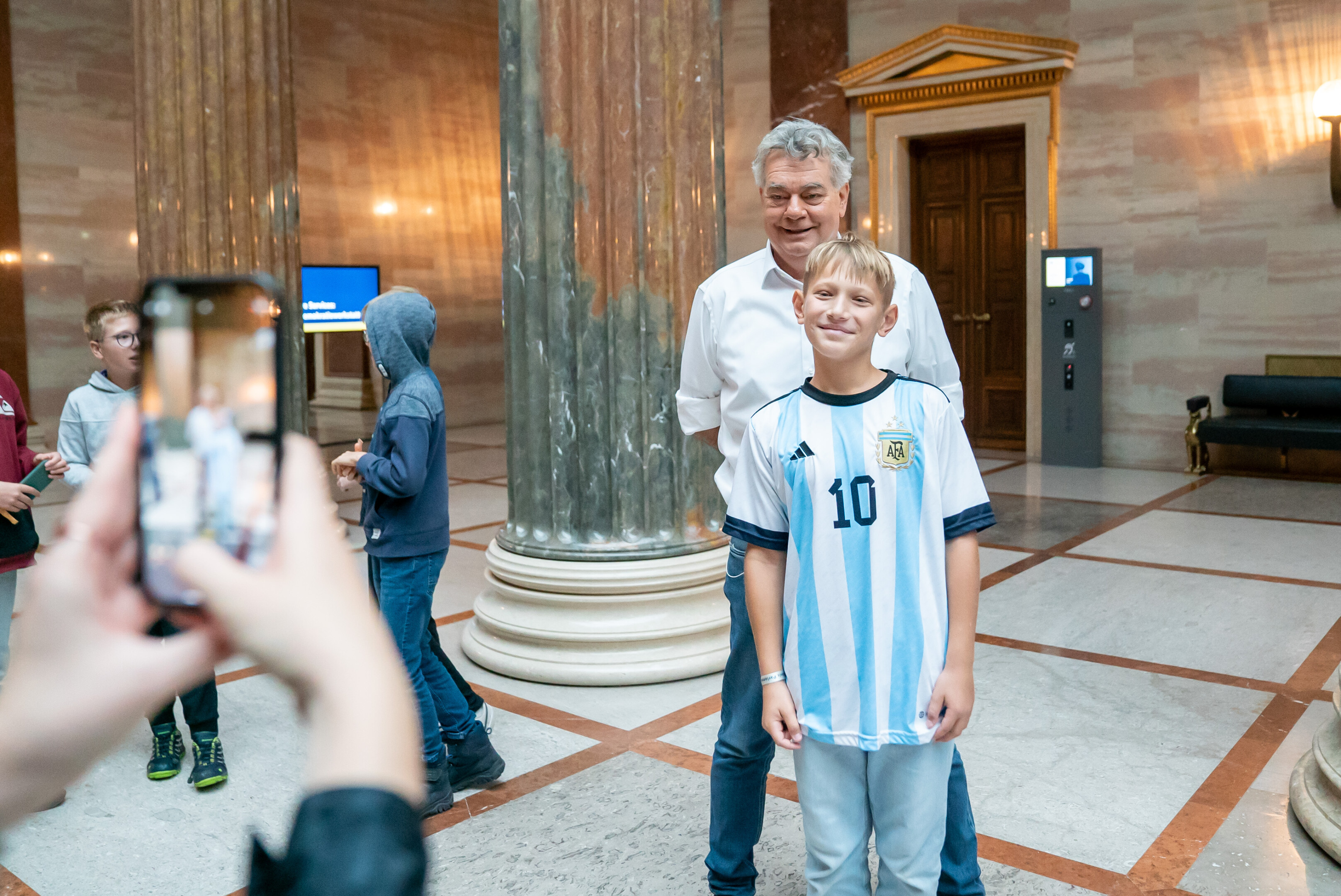 Dieser Einladung wurde nun nachgegangen und es kam zu dem versprochenen Zusammentreffen. Vizekanzler Kogler führte dabei durch das Parlament, zeigte der Klasse seinen Sitzplatz im Sitzungssaal und beantwortete im separaten Besprechungszimmer die Fragen der 2A. Neben den eigenen Ideen und Visionen der Schüler:innen für Österreich, Fragen zur Inflation und zur Klimakatastrophe stellte sich der Vizekanzler auch persönlichen Fragen: Lieblingseissorte, Team Messi oder Team Ronaldo und Spitznamen zu Schulzeiten.