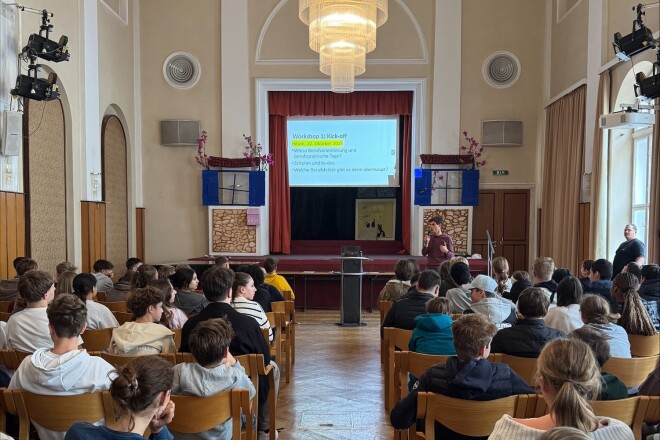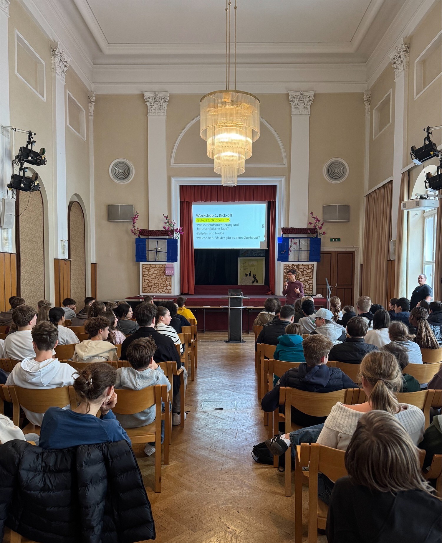 Am 22.10.25 fand für die 4. Klassen des Village– und Rainergymnasiums der erste Workshop im Rahmen der Berufsbildung und Bildungsberatung statt. Zuerst erhielten die Schülerinnen und Schüler wichtige Informationen zu den Berufspraktischen Tagen. Im Anschluss wurde den Jugendlichen erklärt, welches Programm sie in der 4. Klasse erwartet und inwieweit ihnen dies bei der weiteren Orientierung und Zukunftsplanung helfen soll.