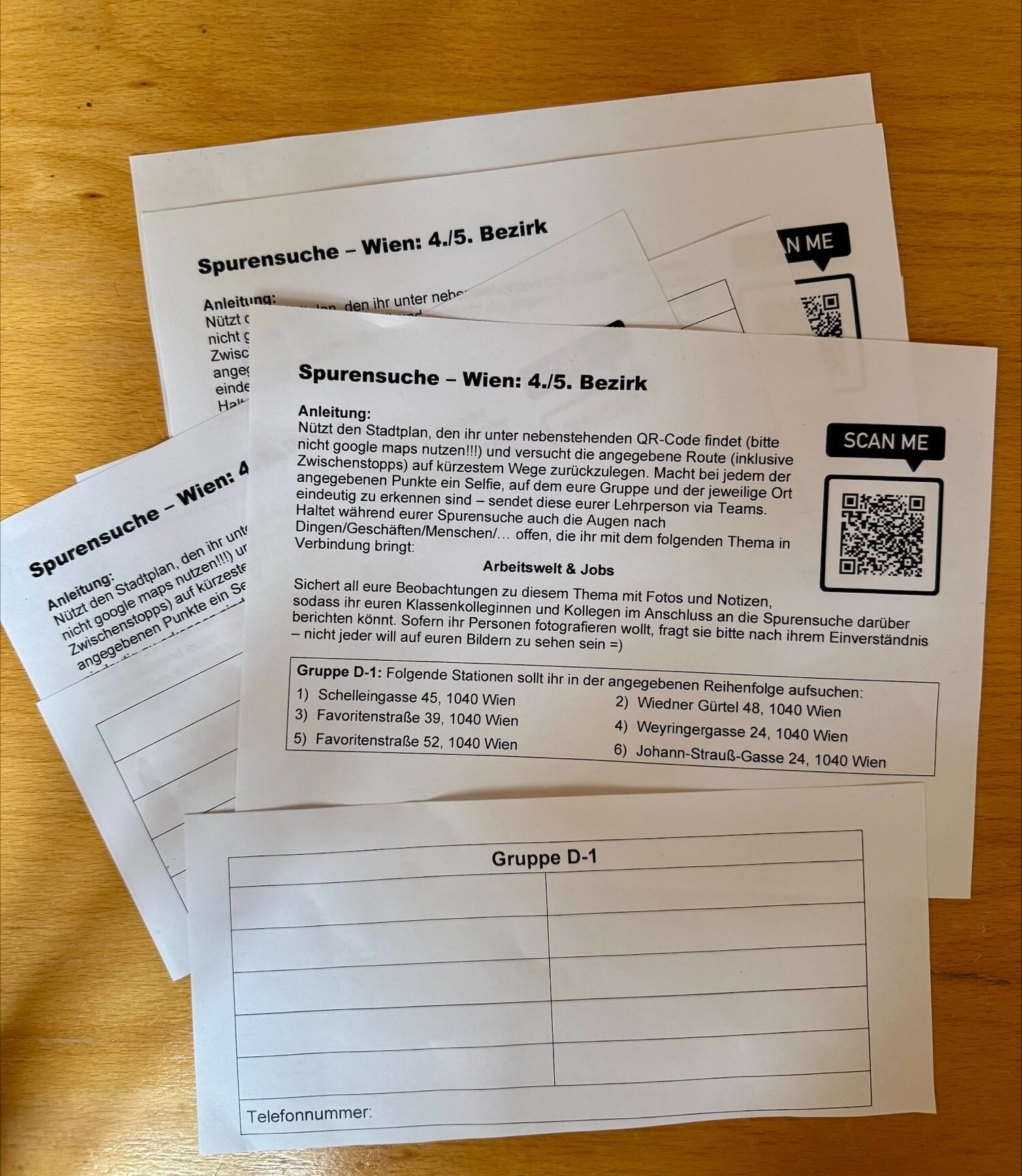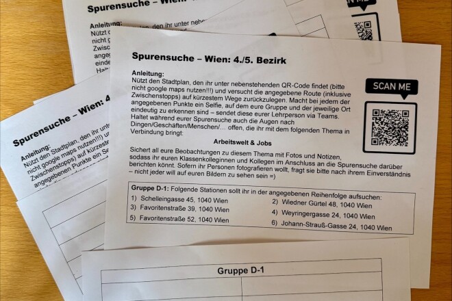 Um auch gleich selbst aktiv zu werden, durften sich die Schülerinnen und Schüler danach eine Stunde lang auf Spurensuche im vierten und fünften Bezirk begeben. Hier sollten sie die Augen offenhalten und verschiedenste Berufe in unserer Umgebung entdecken. Die Schülerinnen und Schüler berichteten in einer Feedbackrunde von ihren Erfahrungen und tauschten sich mit ihren Klassenkolleg:innen aus.