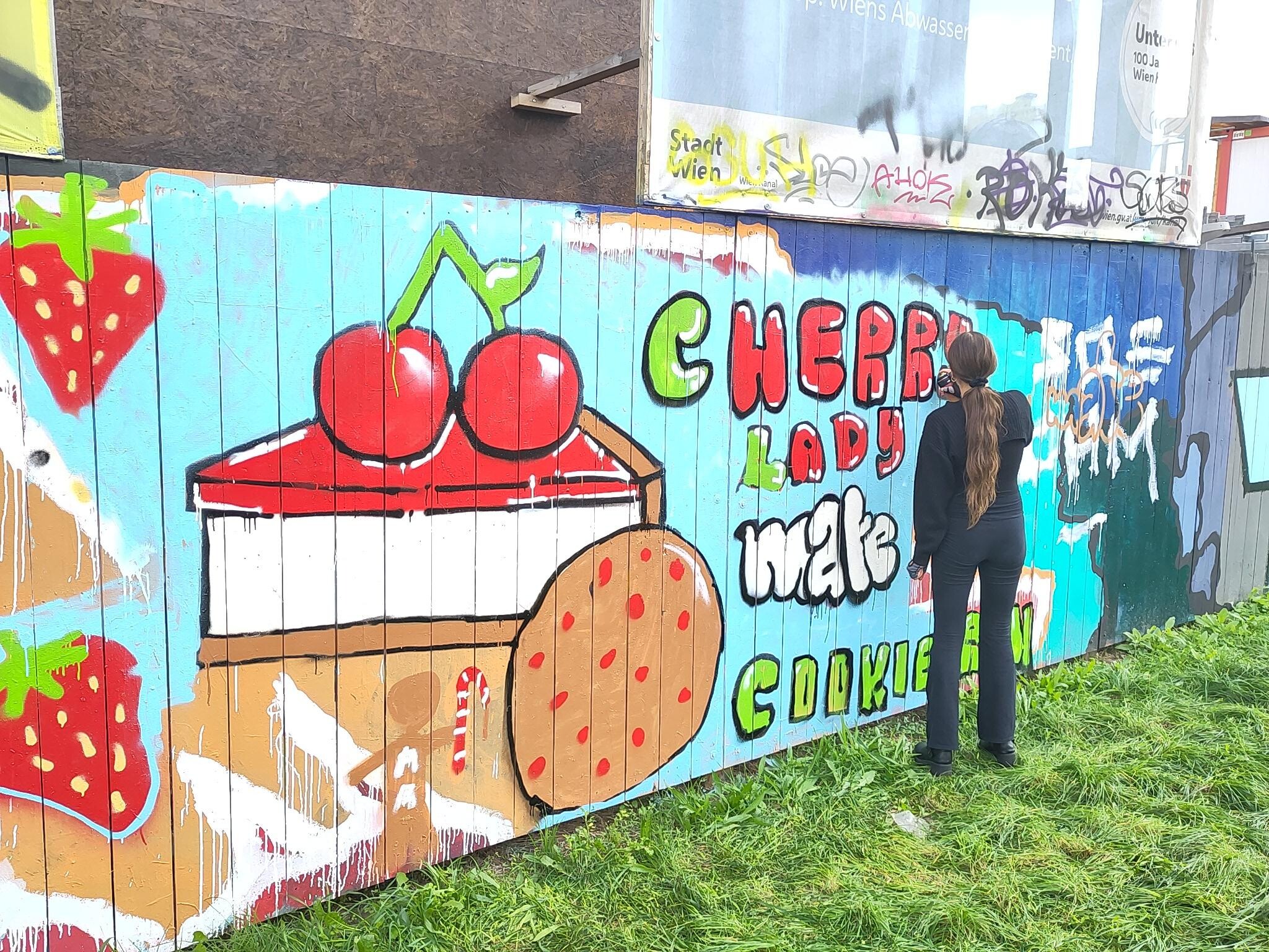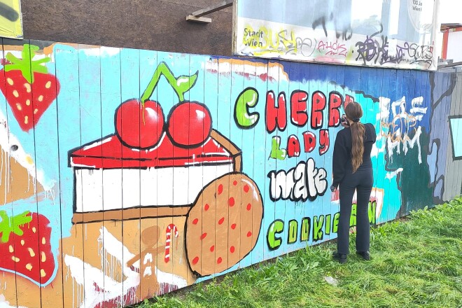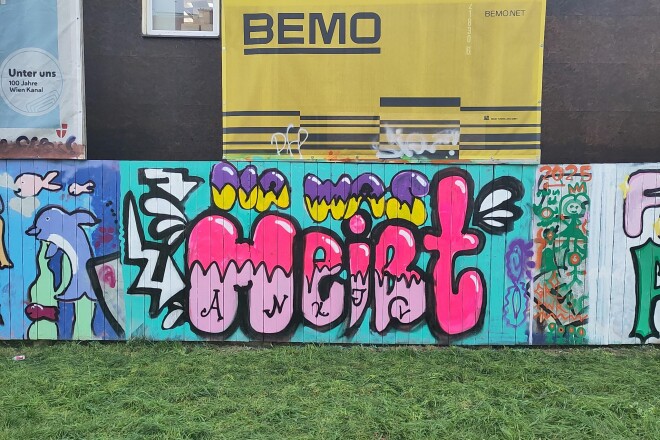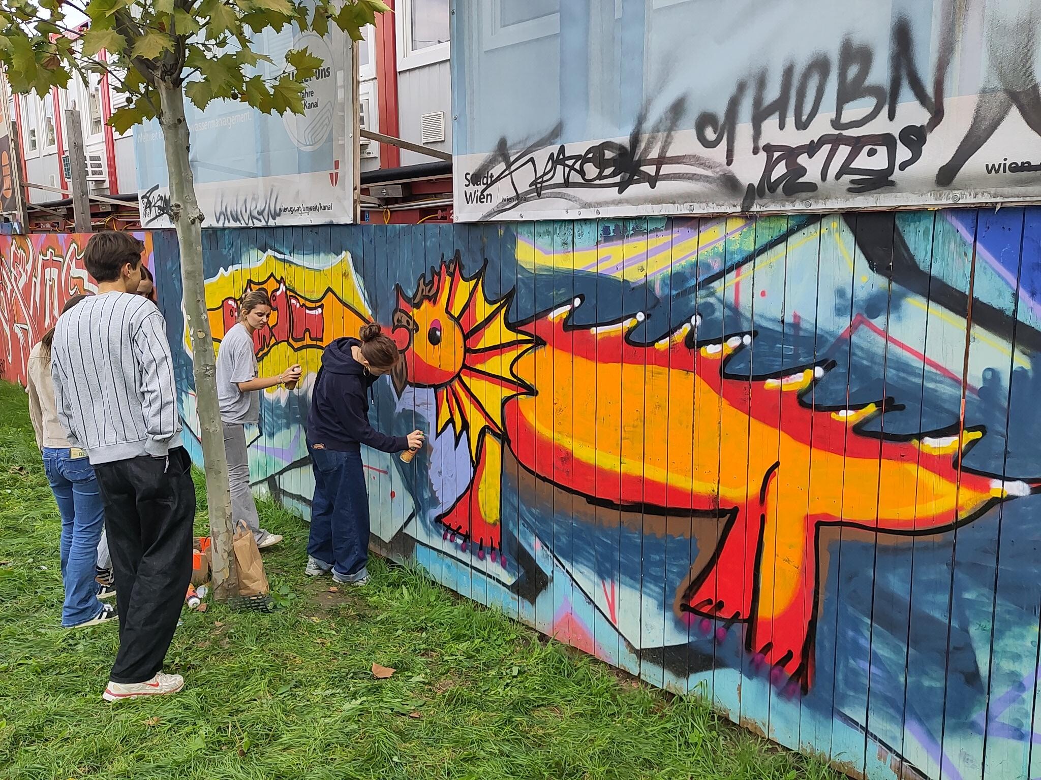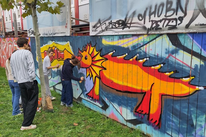 Die 8B und 8C haben auf einer legalen Graffiti-Wand in kleinen Gruppen jeweils ein Bild gemalt. Gestaltet wurde der Holzzaun einer riesigen Baustelle am Margaretenplatz. In Wien gibt es sehr viele Möglichkeiten, legal Graffitis zu malen. Auf der Webseite Wienerwand.at werden alle Orte angegeben. Und es ist keine Voranmeldung nötig!