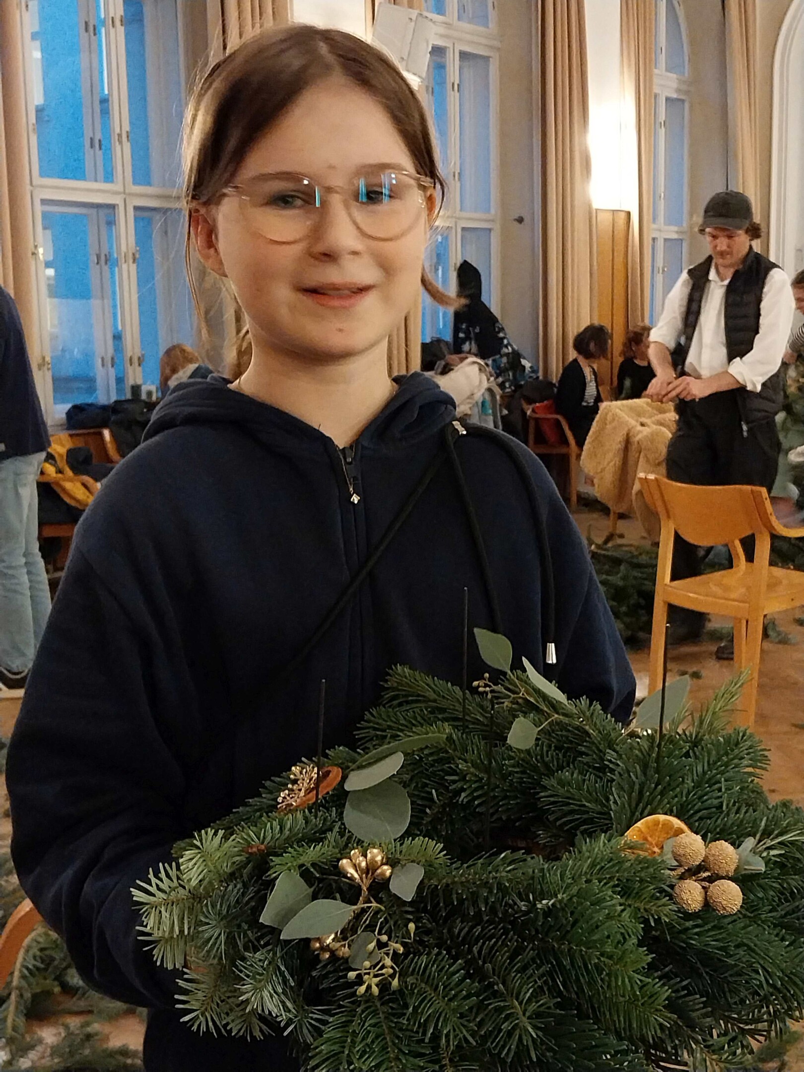 Das merkt man daran, dass sich schon vor Start unseres traditionellen Adventkranzbindens eine Schlange von Kindern und Eltern vor dem Festsaal bildet.