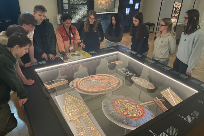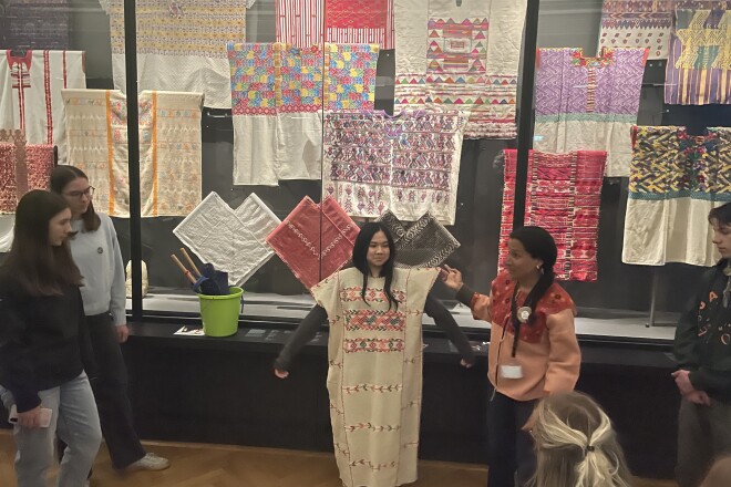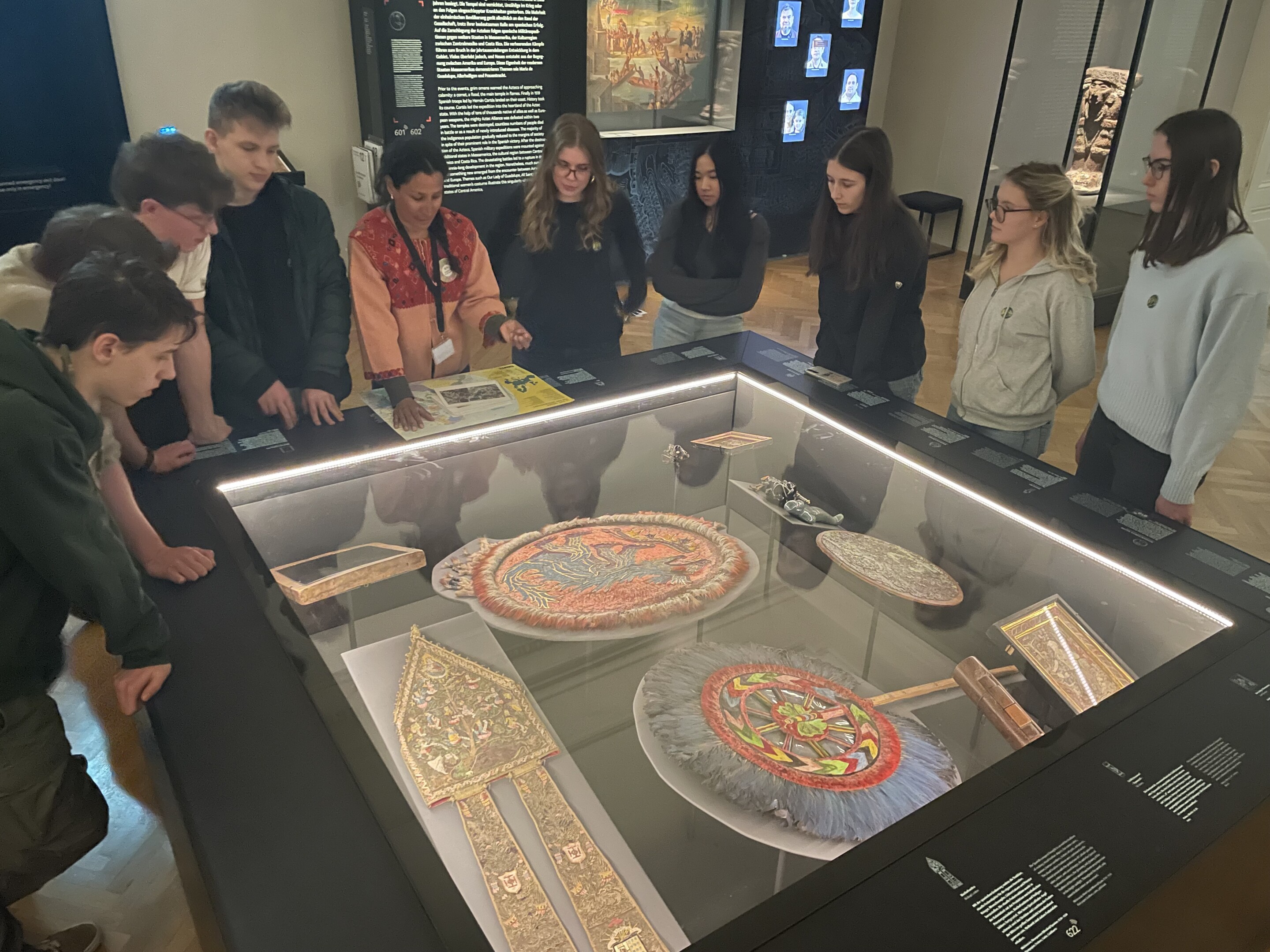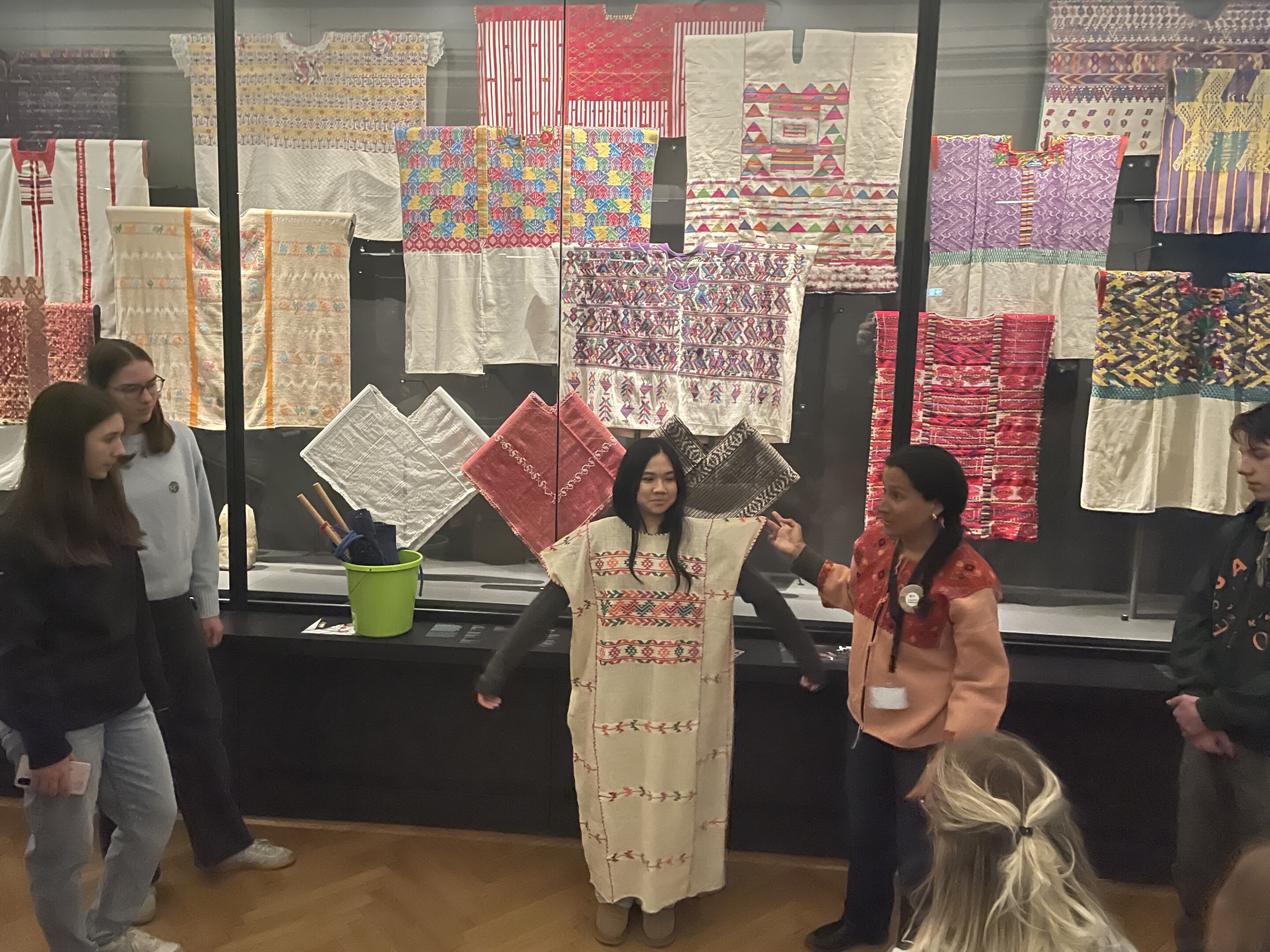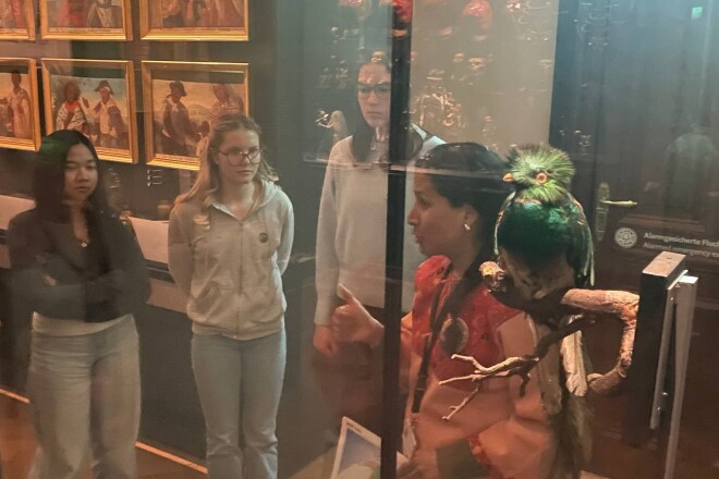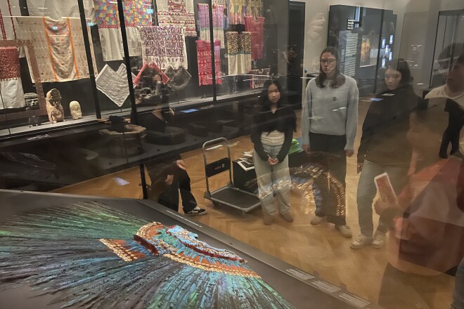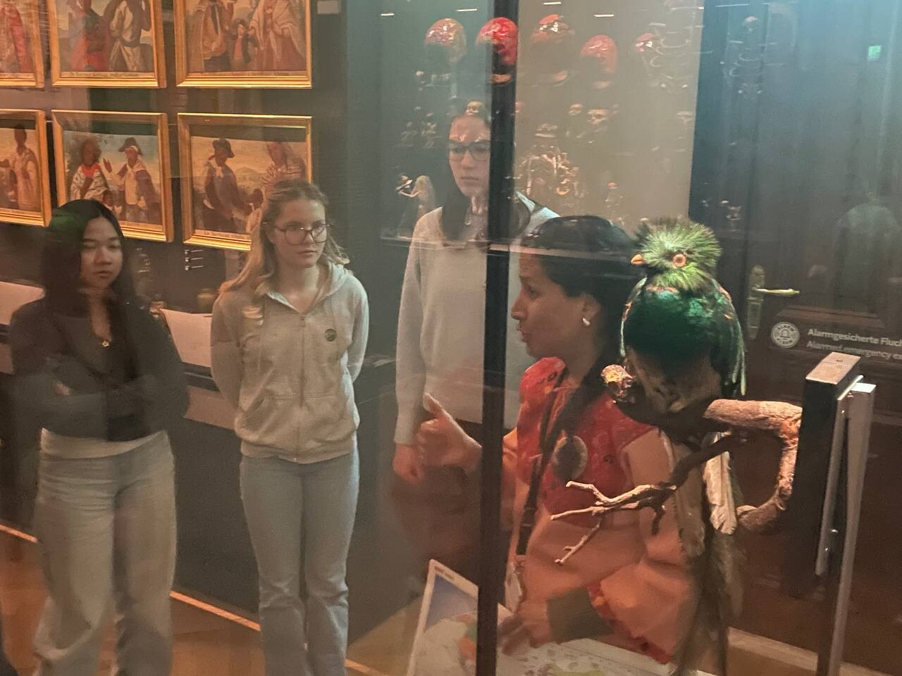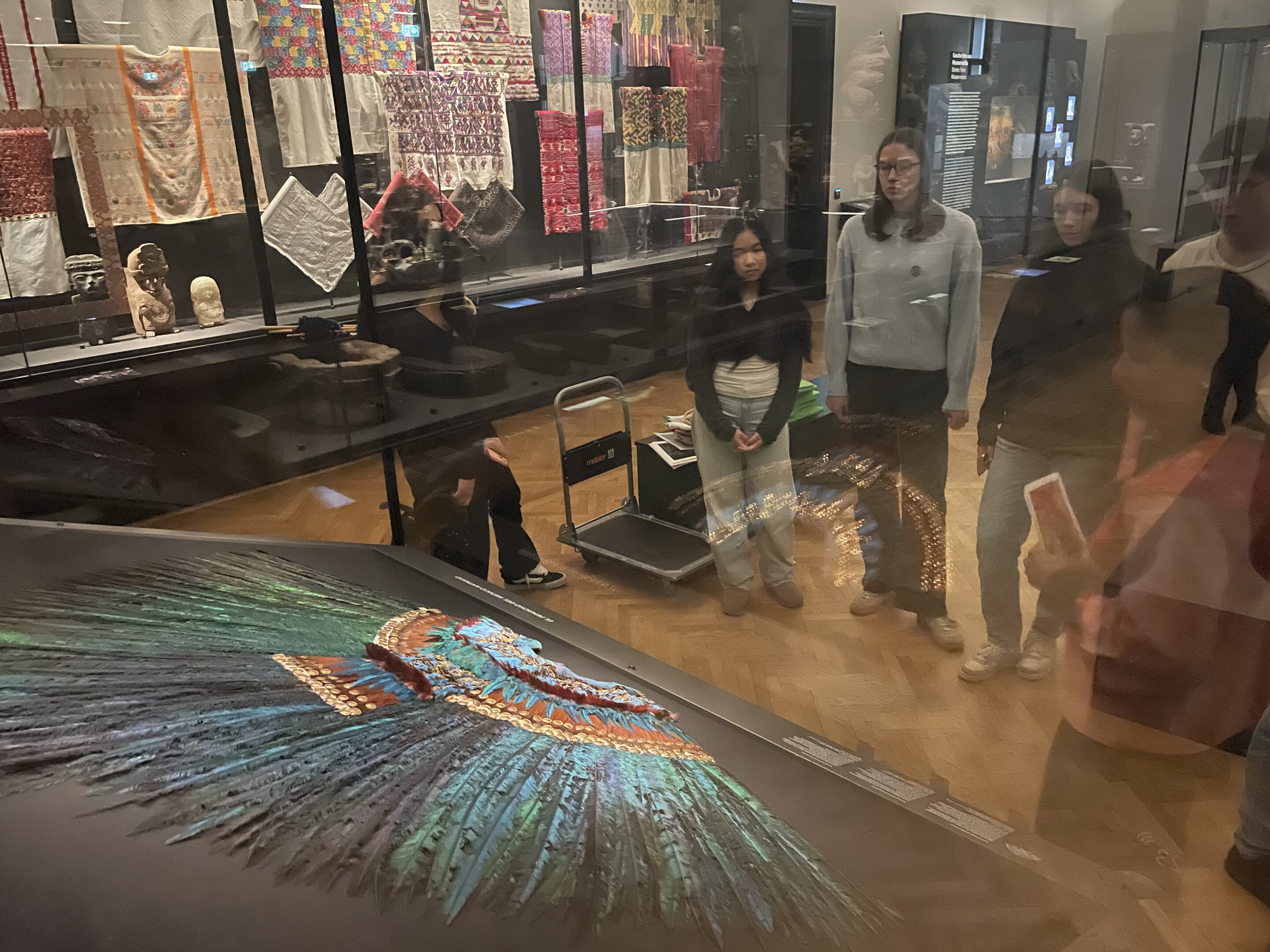 Ein besonderes Highlight war der berühmte Federkopfschmuck (Penacho), der oft mit dem Aztekenherrscher Moctezuma II in Verbindung gebracht wird. Die Schüler:innen erfuhren auf Spanisch die Hintergründe zu diesem einzigartigen Objekt und diskutierten seine kulturelle Bedeutung sowie die ungeklärte Frage, wie er überhaupt von Mexiko nach Wien gelangt ist.