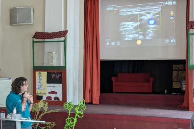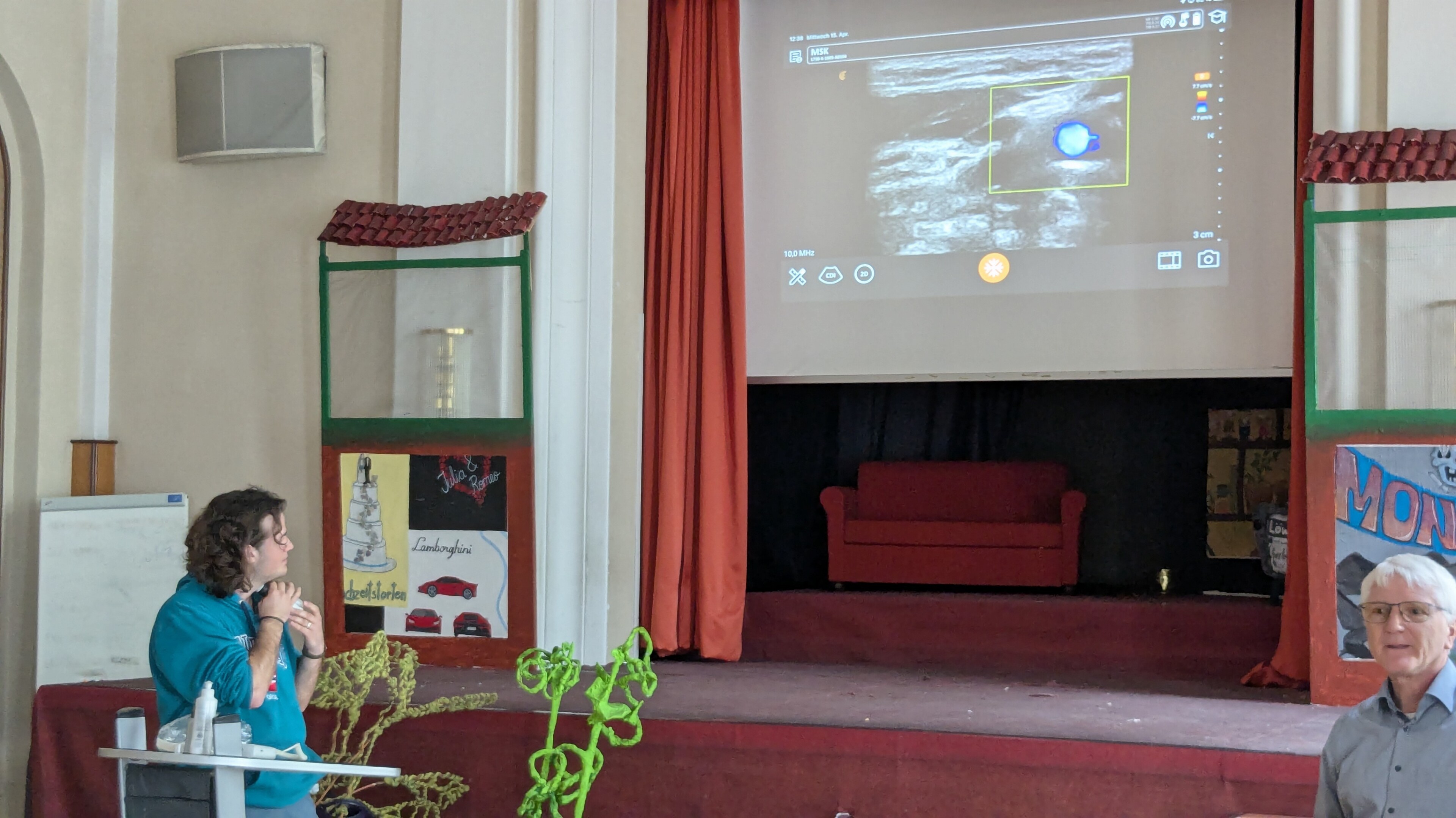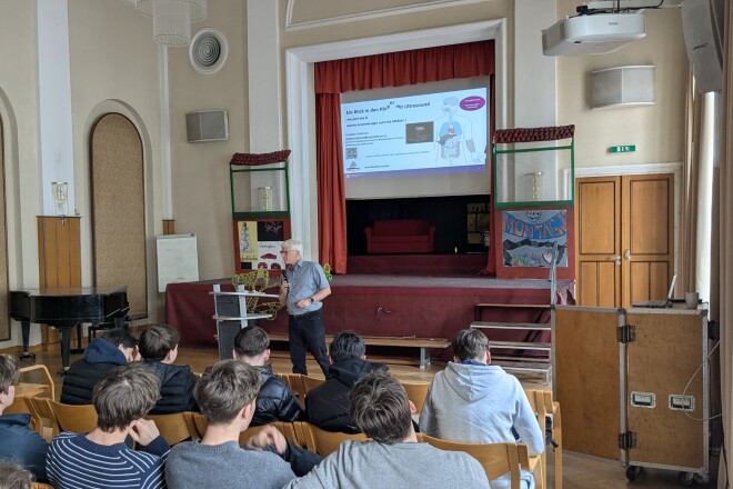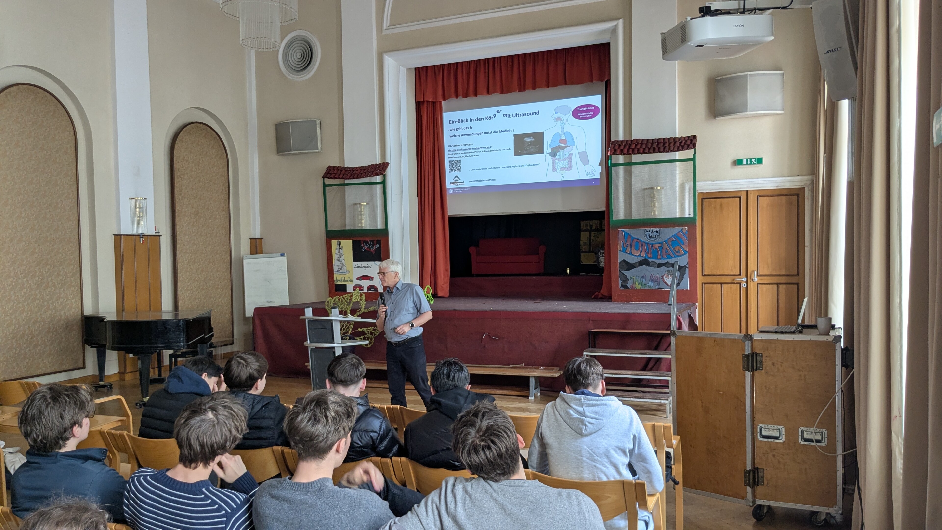 Er informierte uns über die physikalischen Grundlagen und die aktuelle Verwendung von Ultraschall in der medizinischen Diagnostik. Neben vielen praktischen Beispielbildern konnten am Ende Schüler und Schülerinnen ihre eigene Carotis am Bildschirm darstellen. Wir danken für diesen spannenden Vortrag!