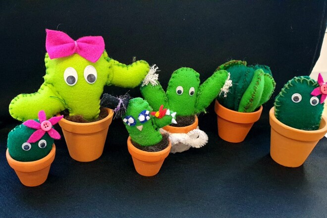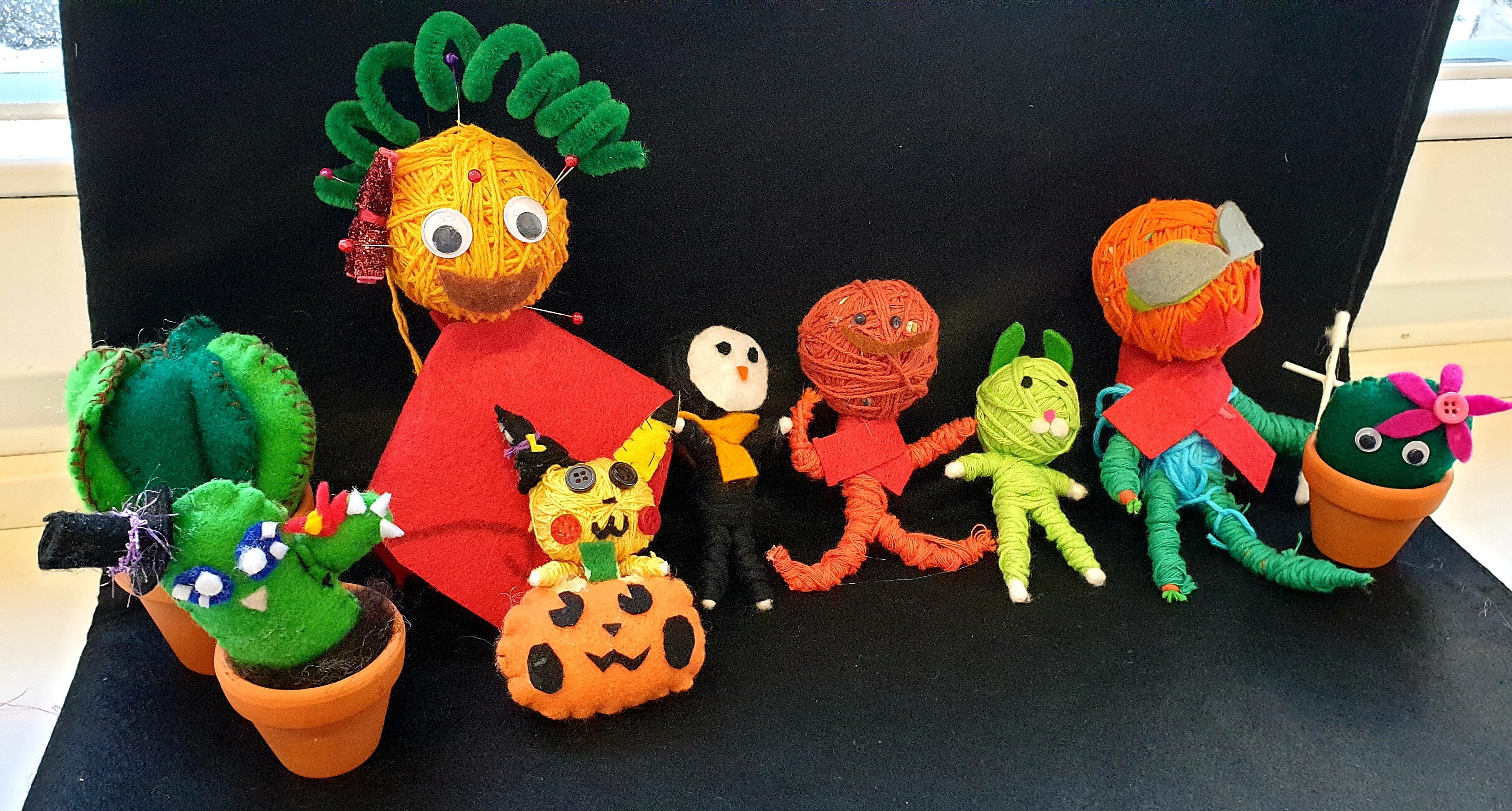 Schöne Herbstferien wünscht die 2B! Im Werkunterricht entstanden stachelige Kakteen und verrückte Halloween String Dolls.