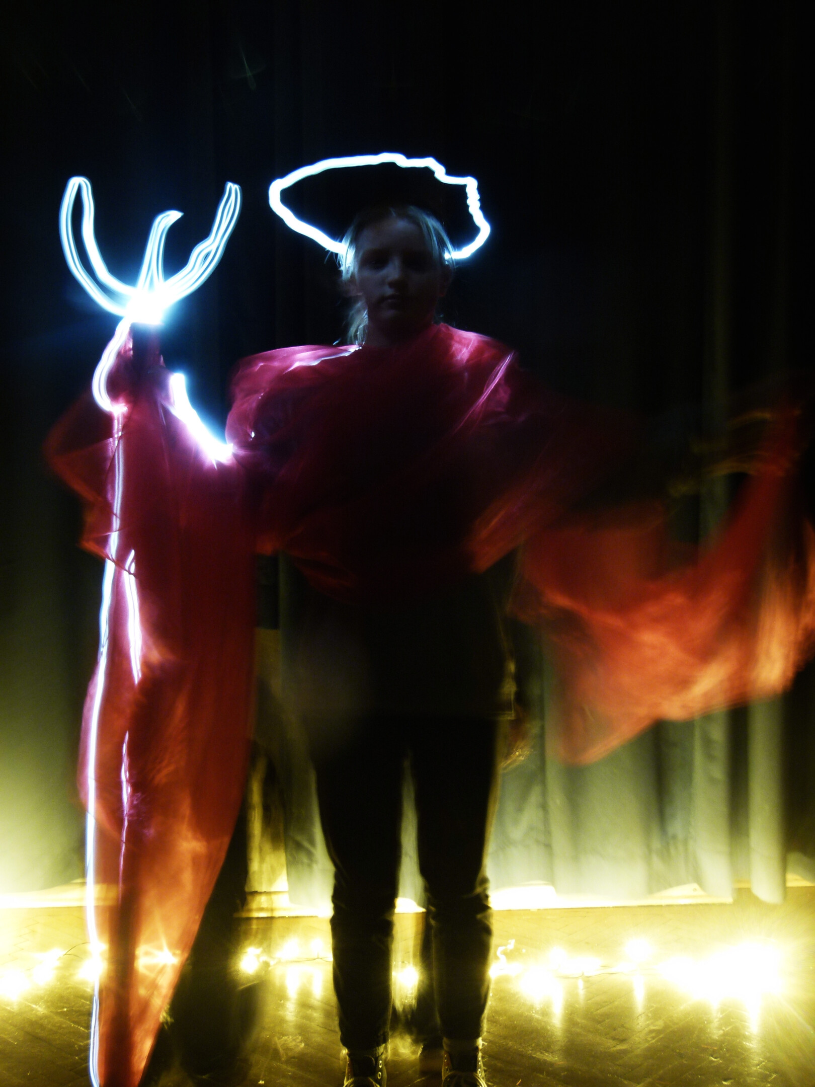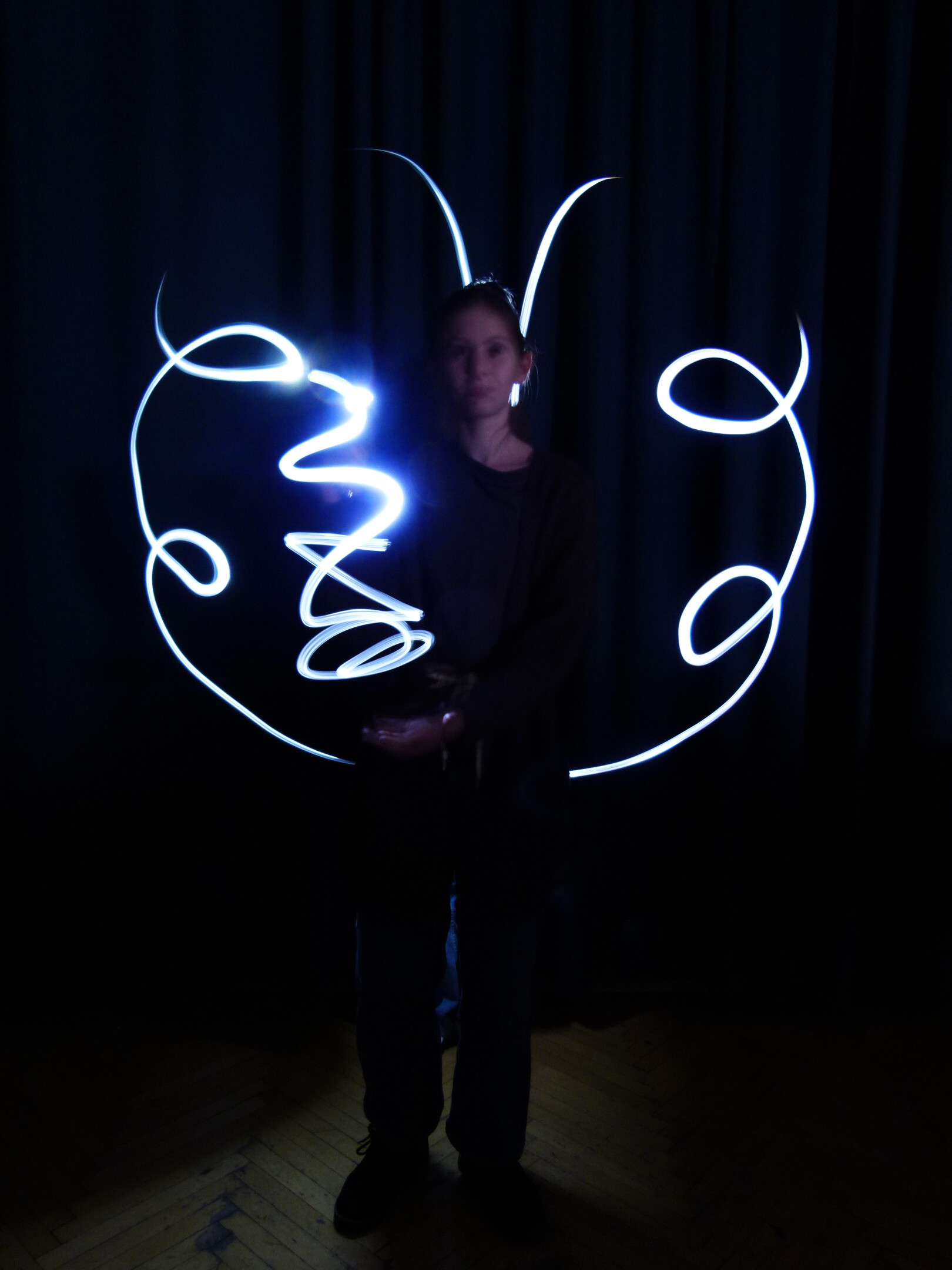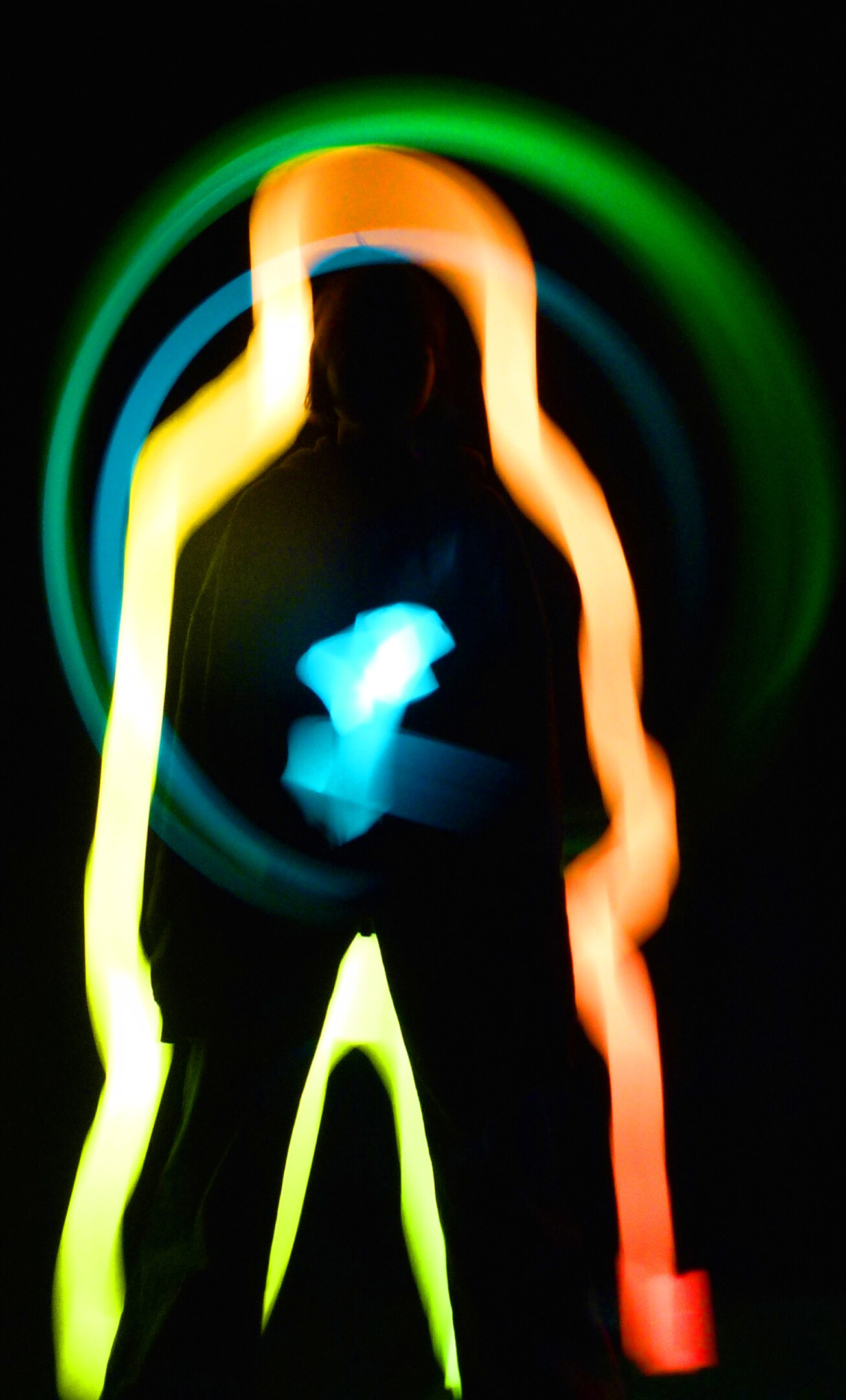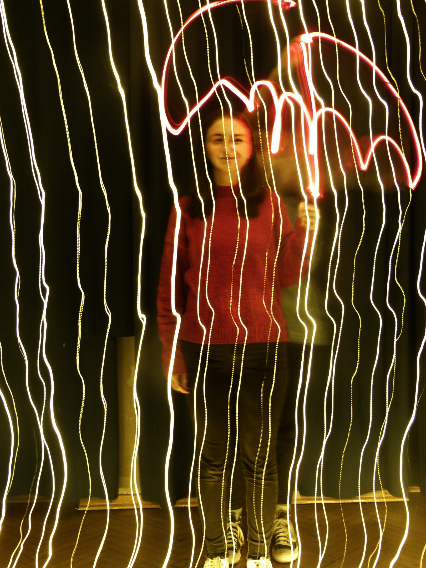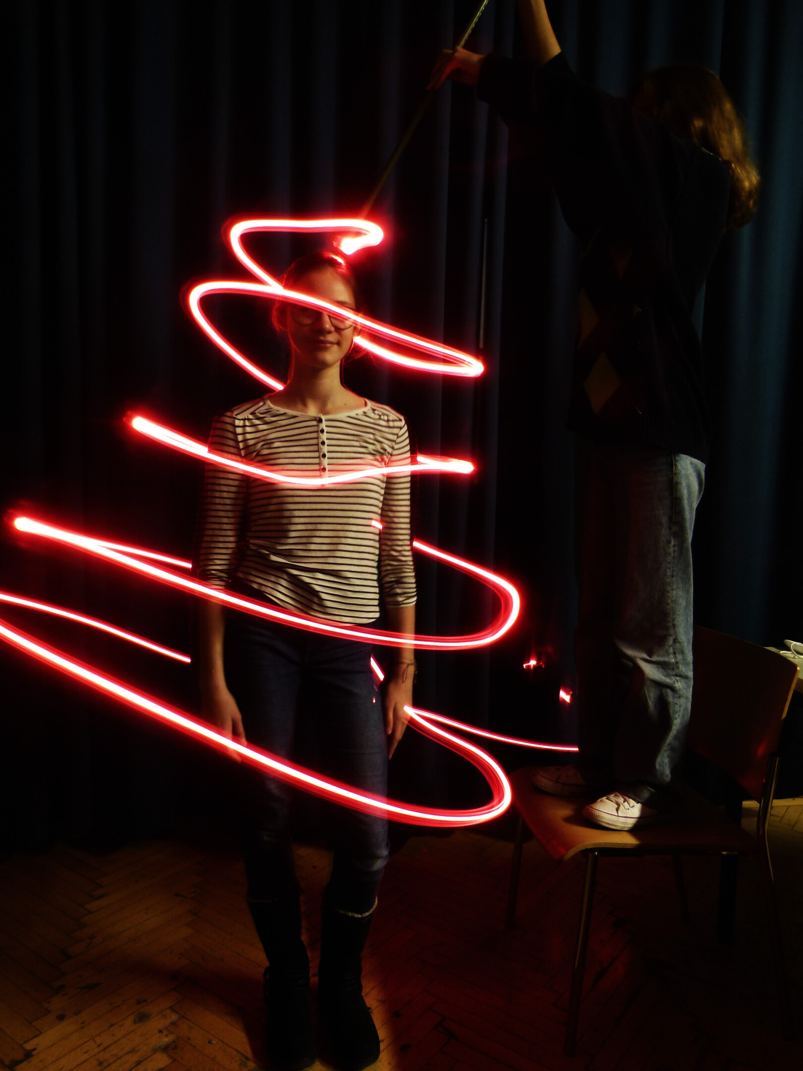 Die beiden Schülergruppen experimentierten mit unterschiedlichen Lichtquellen im dunklen Raum. Es entstanden Lichtzeichnungen durch lange Belichtungszeiten und kreative und spontane Aktionen. Bei den Stillleben mit Gläsern versuchten die Schülerinnen und Schüler das Mischen von Farben im Bild festzuhalten. Der experimentelle Aspekt stand im Vordergrund, die Ergebnisse sind überzeugend und farbenprächtig.