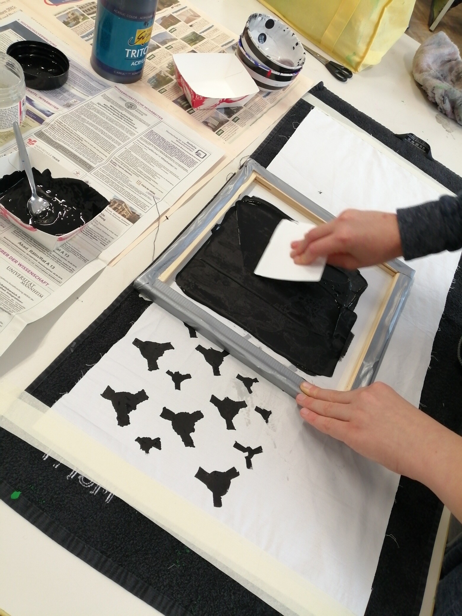 Die Schülerinnen und Schüler der 4BR haben einen Rapport entworfen, zweifärbigen Siebdruck kennengelernt und mit dem bedruckten Stoff einen Turnbeutel genäht.
