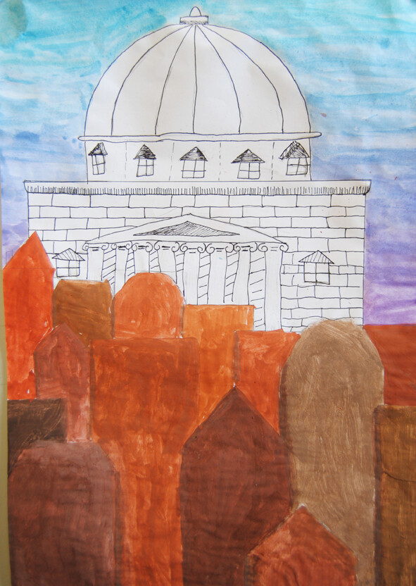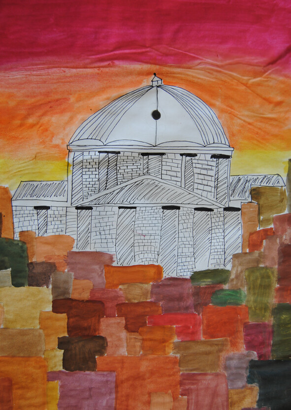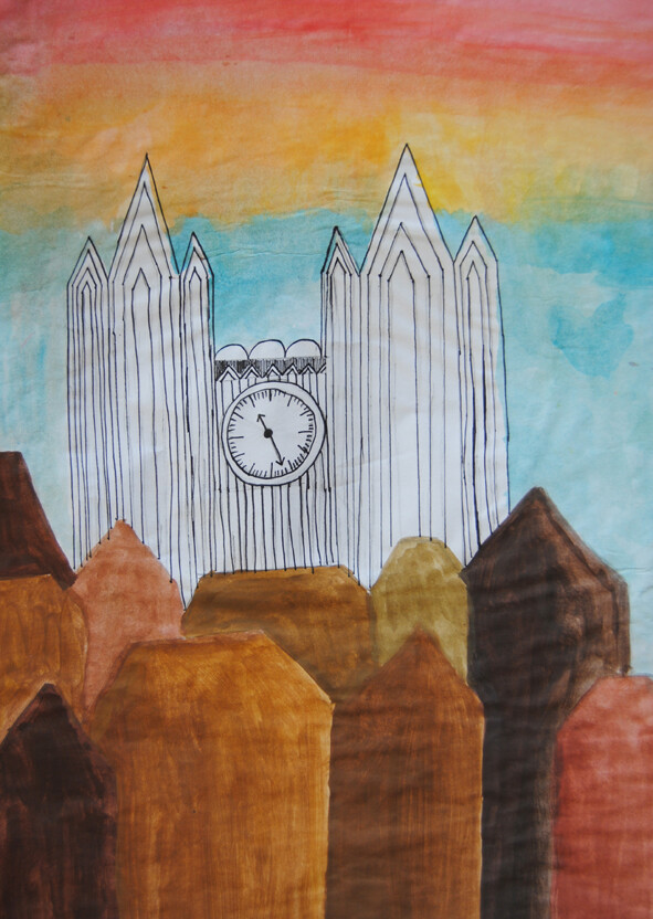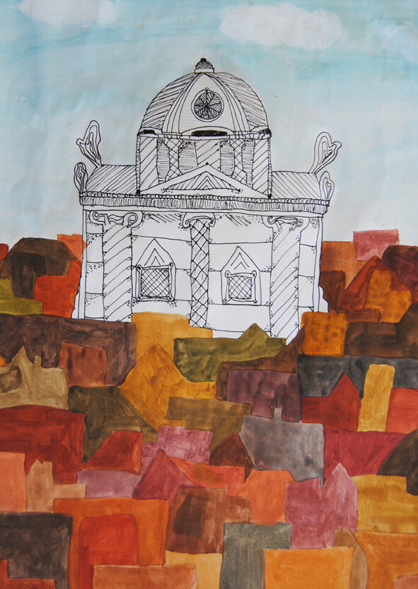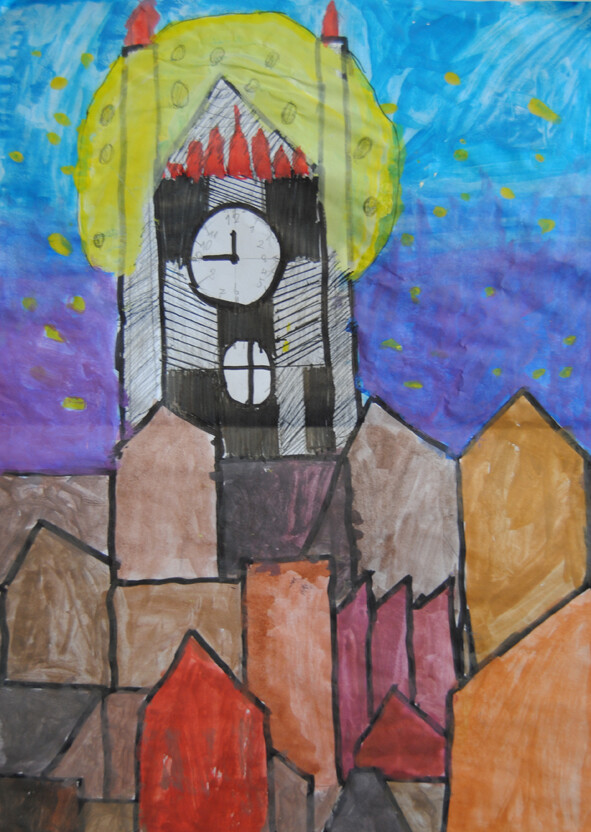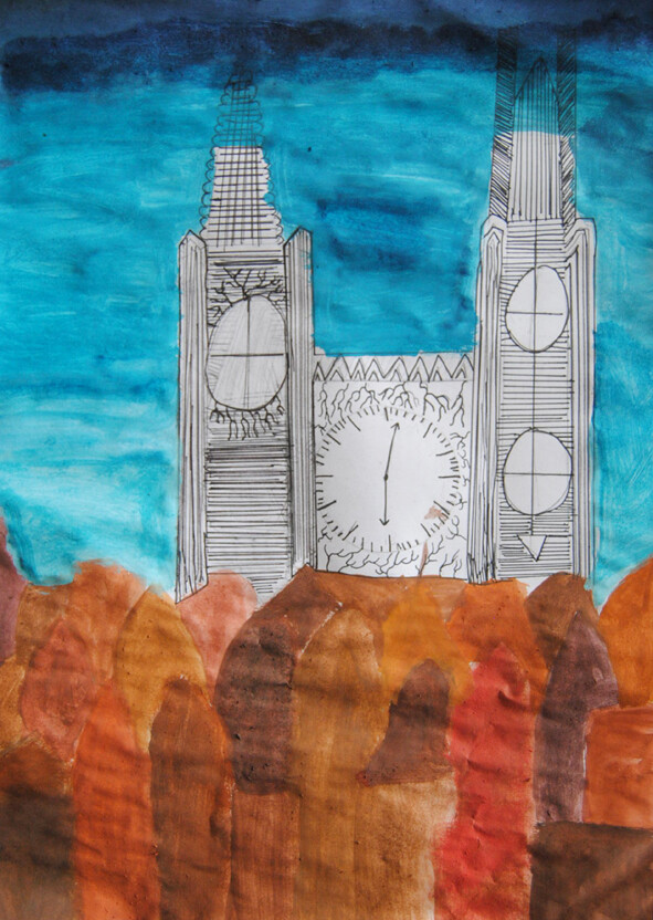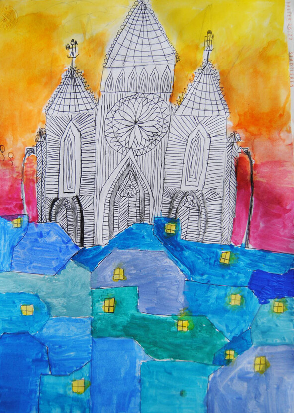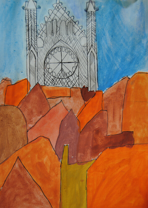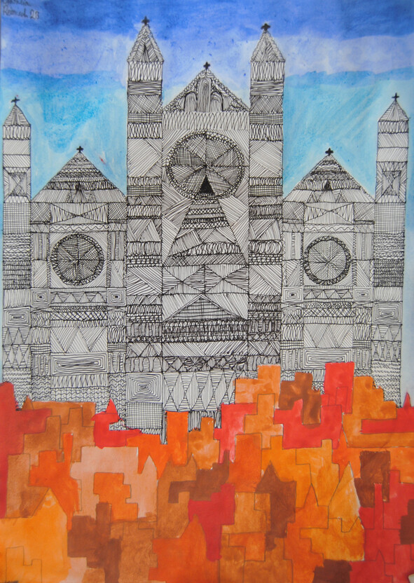 Im BE-Unterricht wurden Merkmale der gotischen und der Renaissance- Architektur besprochen und danach die Aufgabe gestellt, ein "mächtiges" Gebäude, in Anlehnung an einen der beiden Stile, graphisch darzustellen. Dieses sollte eine (flächig gemalte) kleinteilige Stadtlandschaft "überragen". Eigenwillige Interpretationen der beiden Baustile entstanden.