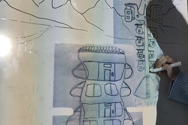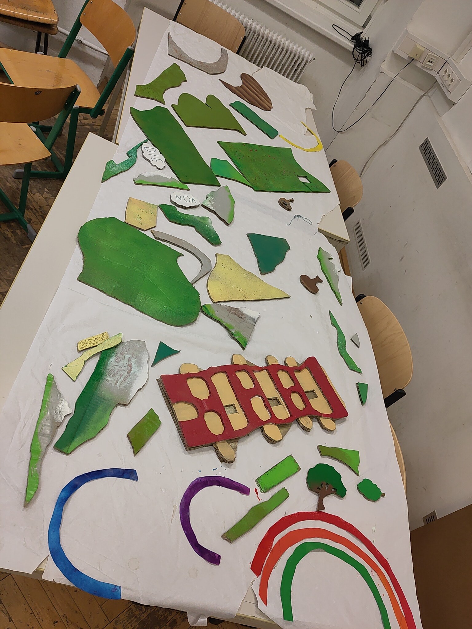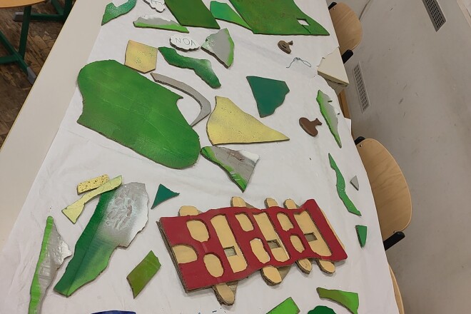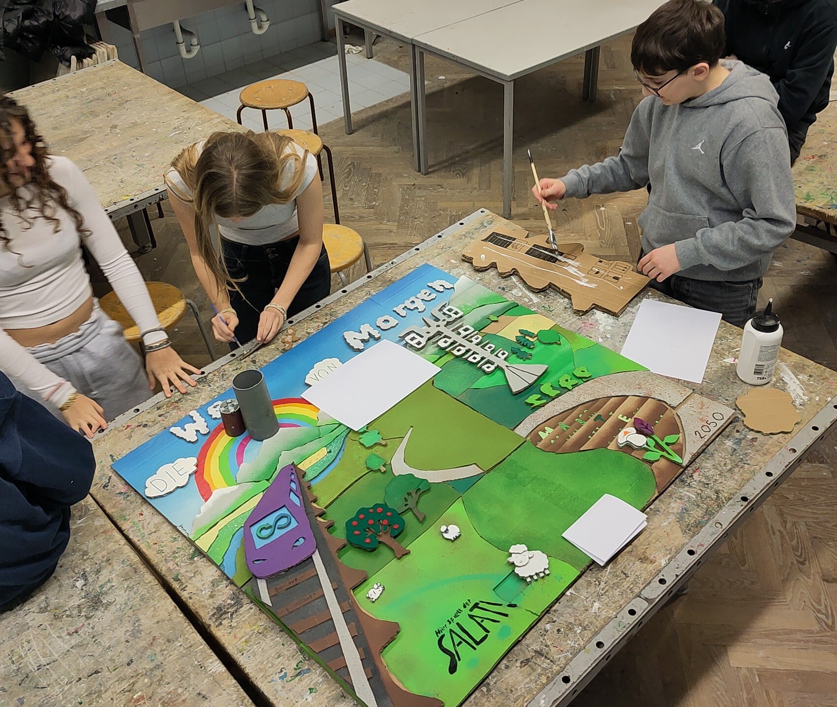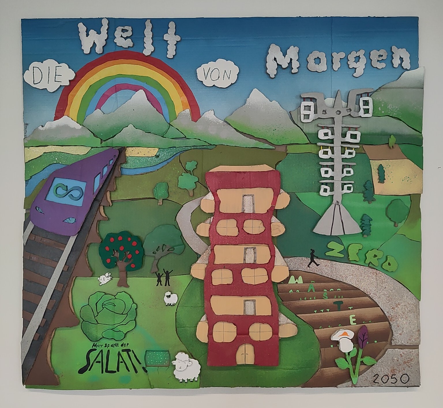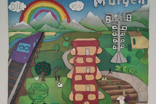Die 4D hat sich in Technik und Design mit der Vision auseinandergesetzt, wie die Welt von morgen aussehen könnte. Zentrale Elemente sind die Kreislaufwirtschaft und das Ziel der EU, bis 2050 keinen Müll mehr zu produzieren (Zero waste). Zahlreiche Zeichnungen wurden in diesem großen Bild vereint. Alle Elemente wurden schließlich aus Karton ausgeschnitten, mit Farbe besprüht und wie ein großes Puzzle zusammengefügt.