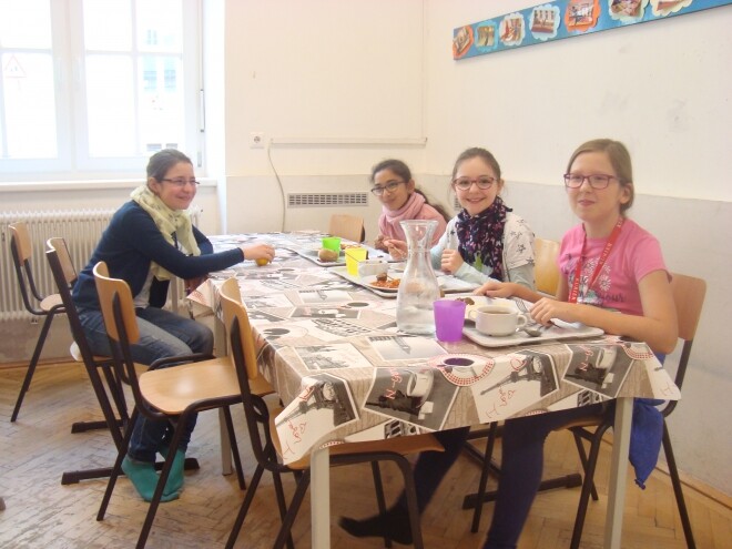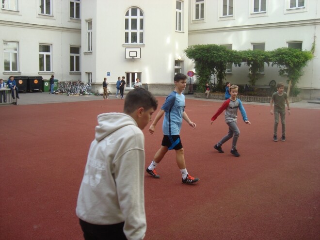 Das Gebäude der Tagesbetreuung ist ein neuer, lichtdurchfluteter Pavillon in Hof. Dieser dient uns als Aufenthalts- und Freizeitraum. Wir haben dort viele Spiele und einen Fußballtisch. In den beiden Speisesälen sind wir zum Mittagessen. Die Bibliothek steht uns ebenfalls täglich zur Verfügung. Wer gemütlich in einem der vielen Bücher schmökern möchte, kann sich in der Freizeit vor der Lernzeit dort aufhalten. Der Hof ist am Nachmittag ebenfalls für die Kinder der Tagesbetreuung zugänglich. Hier sind wir täglich (außer bei starkem Regen). Spiel, Spaß und Bewegung an der frischen Luft mit Tischtennis, Ballspielen aller Art, Federball oder beim Entspannen auf einer schattigen Parkbank vor und nach der Lernzeit sind hier möglich.